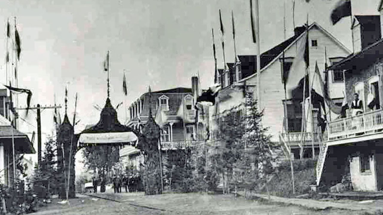 Autre expansion postérieure. Probablement que son immeuble était rendu trop petit pour loger toute sa marchandise et pour pouvoir accueillir plus de clients, il érigea un autre immeuble de même style mais deux fois plus long de l'autre côté de la rue, juste en face du premier, vers 1895 (photo 3). Il y avait cinq lucarnes. Remarquez son enseigne EPHREM POULIN MARCHAND GÉNÉRAL. Son premier édifice est devenu sa résidence et il a déménagé son commerce dans sa nouvelle bâtisse beaucoup plus vaste. C'était un secteur achalandé et très populaire, la preuve en étant qu'on y a aménagé une arche lors d'une fête religieuse (photo 4). Autre décor de célébration festive à la photo 5. Aussi un achalandage impressionnant près de cet édifice à la même époque (photo 6). Un grand avantage qu'il avait était d'être tout juste à côté du pont de bois de David Roy, favorisant l'accès à son magasin pour tous ceux qui avaient affaire dans l'est. Voyez son imposant magasin situé entre les deux ponts lorsqu'on a ouvert le premier pont de fer en 1912, photo prise à partir de l'ouest (photo 7).