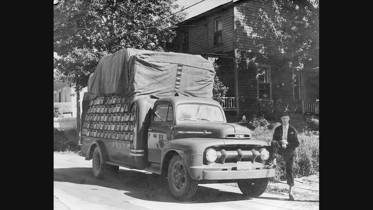 En 1942-43, il s'installe dans de nouveaux bâtiments flambant neufs dans la rue Saint-Antoine (120e rue). L'usine est d'abord au sous-sol de sa résidence (aujourd'hui édifice de la Cordonnerie Saint-Georges) tandis que le reste se passe dans le gros immeuble situé juste à côté (photo 2), l'entreposage des bouteilles vides, des glacières et des frigos à liqueurs ainsi que l'atelier de réparation étaient au deuxième étage, tandis que tous les camions étaient chargés au rez-de-chaussée à chaque jour afin d'être prêts à partir tôt le lendemain matin 6 jours par semaine 52 semaines par année (photos 3, 4 et 5: les camions à différentes époques). Il participait régulièrement à des expositions commerciales (photo 6, vers 1955).