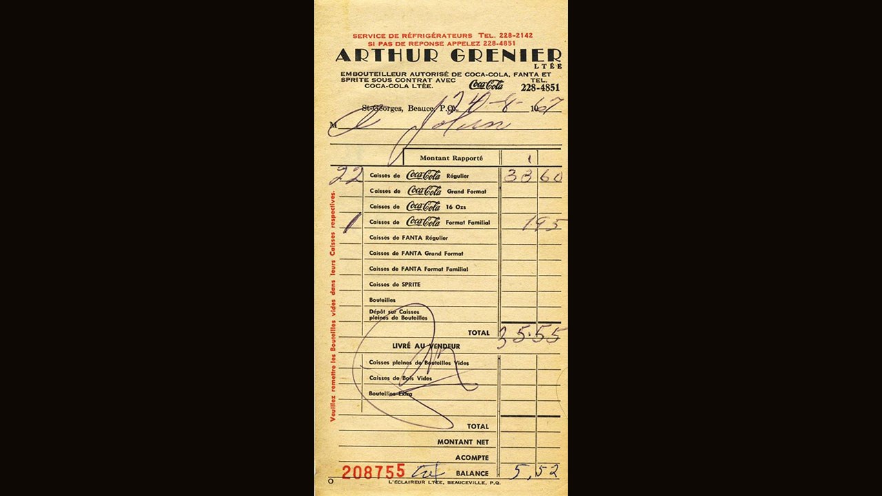 Arthur Grenier fut l'un des premiers mécènes à donner des $$$ lors des débuts de l'OTJ de l'ouest (ancien Parc des 7-Chutes). De plus, son camion y transportait les enfants vers 1940 (photo 8 ). Une facture de Coke du 29 août 1967 (photo 9): wow, 22 caisses de coke pour 33,60$, ce qui revient à 1,53$ la caisse !!!. Est-ce possible?