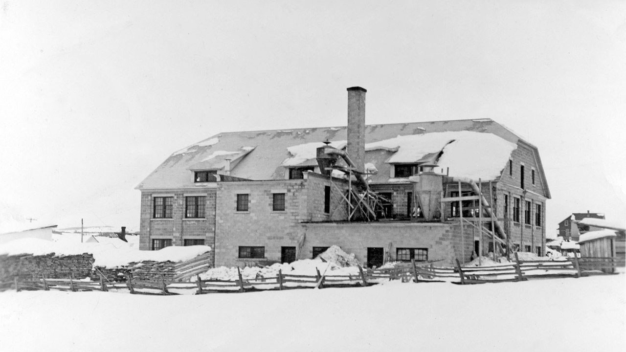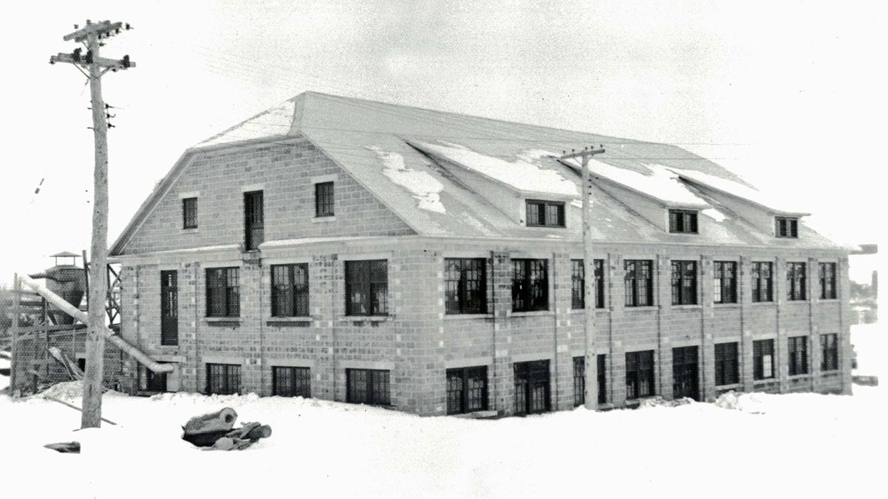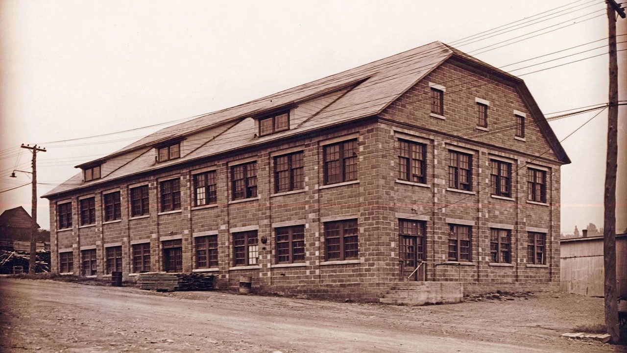 Contrairement aux autres usines de l'époque qui conservaient toutes leur nom anglais, on a toujours nommé celle-ci «la manufacture de talons». On fonda d'abord la manufacture «St-George Shoe Co Ltd» en 1932 (photo 1), mais on réalisa rapidement que c'était un problème de se procurer les multiples genres de talons pour les souliers des dames, difficultés d'approvisionnement et de modèles, changements fréquents de mode, délais de livraisons etc. On démarra donc la même année un atelier de fabrication de talons qui a connu des débuts modestes, à l'étage inférieur d'un grand garage situé au coin de la 118e rue et de la 2e avenue, qu'on voit à la 2e photo.