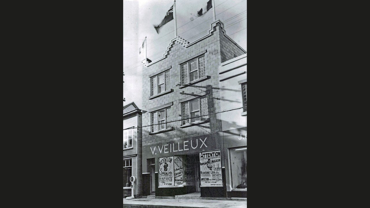 C'est en 1945 que fut fondé le Magasin des enfants sur la première avenue dans le centre commercial de Saint-Georges. C'est un homme d'affaire qui avait auparavant exploité une épicerie, M. Victor Veilleux, qui a démarré ce commerce au rez-de-chaussée d'un immeuble qu'il venait de construire, situé non loin du ruisseau d'Ardoise. La 2e photo (3 étages) date de 1948, pas très longtemps après la construction de cette bâtisse. Comme il y avait beaucoup de demande dans ce secteur, M. Veilleux ajouta un autre étage au début des années '50,  le portant à 4 étages  (photo 3, vers 1958). Il était situé près de la rivière, voisin du magasin de J.A. Roberge puis de son fils Marc Roberge (photo 4 de 1962). Il y opéra avec succès son magasin de vêtements pour enfants pendant environ 15 ans. Ayant acheté entretemps une industrie dans le domaine du bois (Kennebec Woods), il vendit son commerce  de vêtements pour enfants à Mme Marthe Roberge vers 1962. Celle-ci continua les opérations à cet endroit pendant quelque temps, mais les inondations quasi printanières l'ont contrainte à se trouver un nouveau local plus sécuritaire, tout en continuant de bénéficier d'un site tout aussi central.
