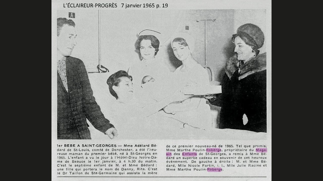 Voyez une publicité du Magasin des Enfants de Mme Roberge dans le journal local du 25 décembre 1963 (photo 5). Celle-ci ne ménagea aucun effort pour attirer la clientèle. Ainsi, pendant plusieurs années, elle organisa une promotion annonçant qu'elle remettrait un cadeau aux parents du premier enfant naissant à Saint-Georges au cours de la nouvelle année. Voyez un reportage paru à ce sujet dans l'Éclaireur-Progrès du 7 janvier 1965; Mme Roberge est à droite sur cette photo, elle était une dame souriante et toujours élégante (photo 6). Elle est décédée en l'an 2000 à l'âge de 75 ans.