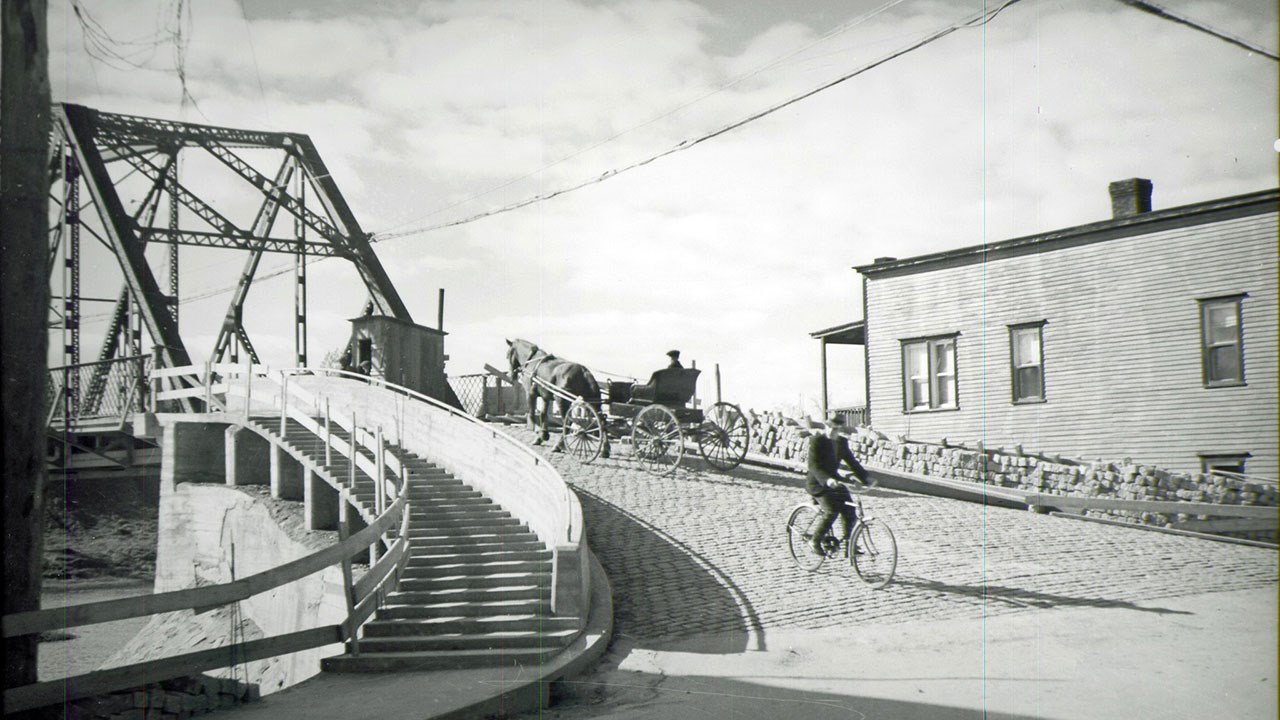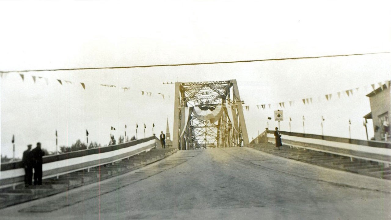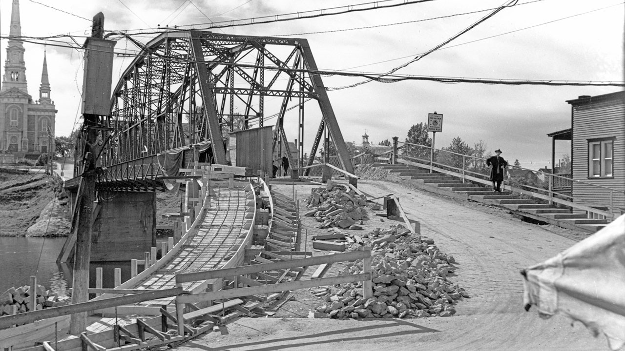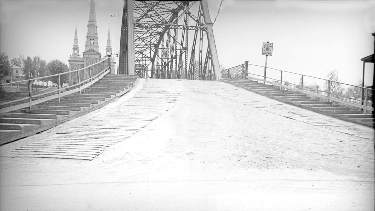 Ce pont fut érigé en 1929 et démoli en 1971. Il était superbe. La première photo, prise vers 1956-57, illustre l'entrée ouest, remarquez les beaux lampadaires à trois globes en verre, il y en avait aussi au milieu du pont et du côté est. Et les clôtures métalliques protégeant les piétons à l'extérieur des larges trottoirs de la montée. On constate que plusieurs piétons traversaient à pied à cette époque. Ceux qui l'ont connu, les plus de 60 ans, ne l'ont pas oublié.