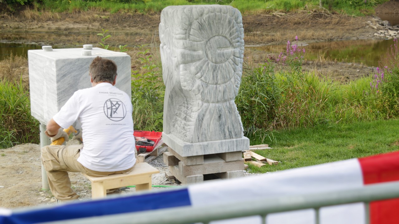 André Bénéteau, artiste-sculpteur originaire de Charente en France, a répondu à l’appel du « Sublime rendez-vous » de Beauce Art en offrant à la population de Saint-Georges et des environs une sculpture de marbre évoquant la vie sur l’île Pozer.