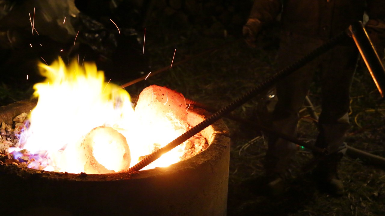 Quoi que le premier essai de la méthode de fonte ait échoué lors du passage d’EnBeauce.com, les artistes ont pu quand même faire fondre leurs métaux plus tôt cette semaine. Le problème auquel ont fait face les sculpteurs est que le bronze en fusion se solidifiait presque immédiatement après sa sortie du four, passant d’une température de plus de 1000 degrés Celsius à 12 degrés aux abords de la rivière Chaudière.