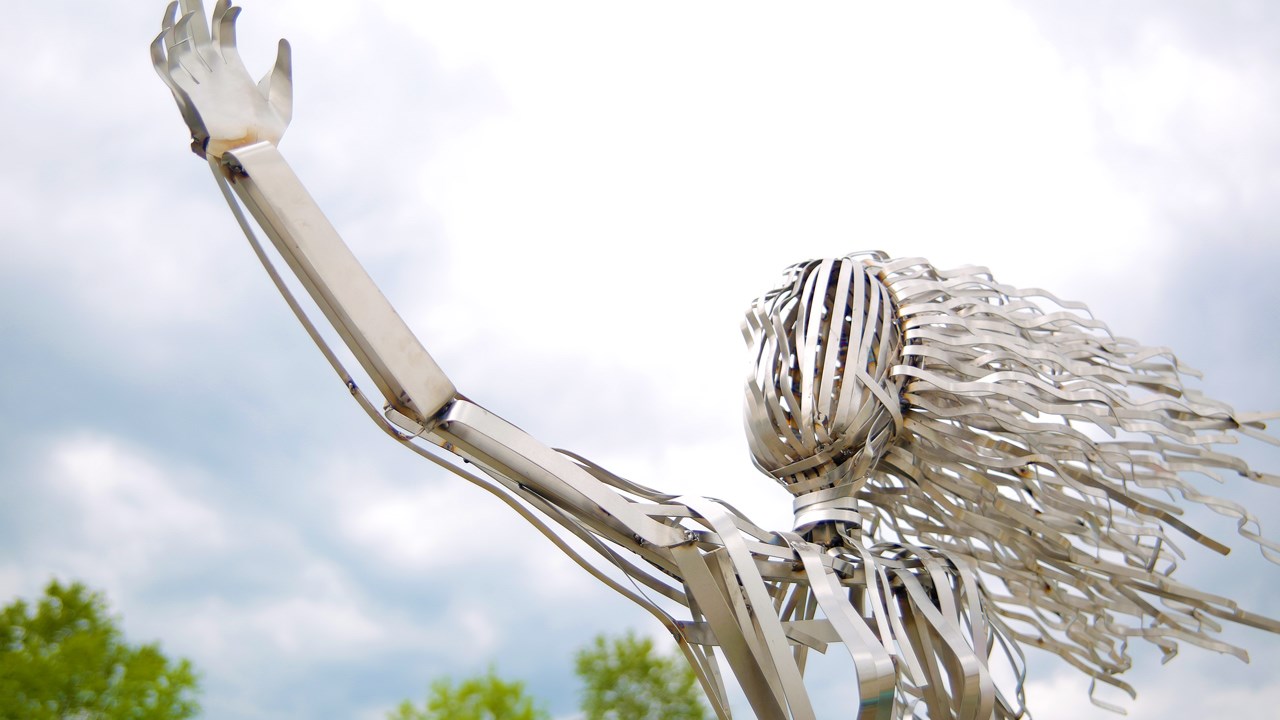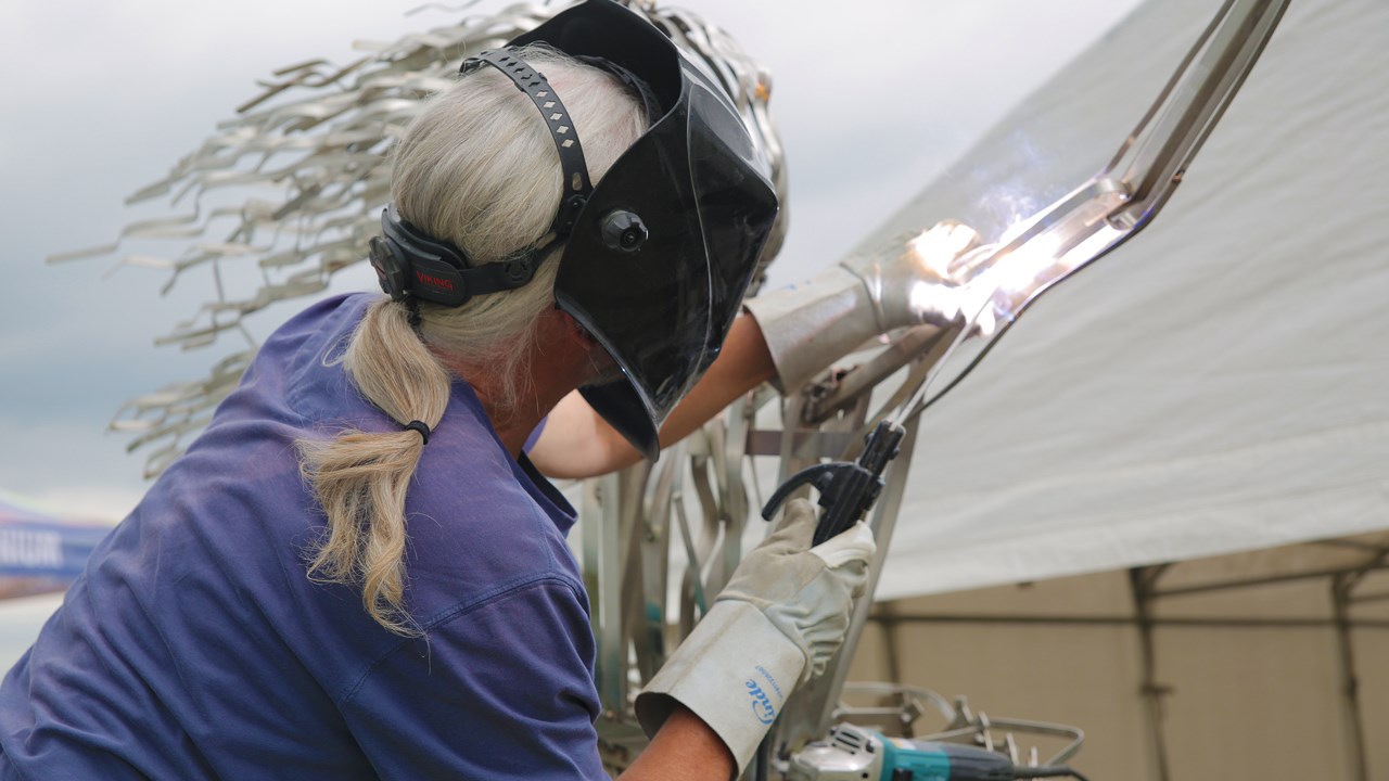 Le personnage de la cavalière, tout comme le cheval, s’avère une structure faite à partir de tiges d’un pouce par un pouce en acier inoxydable. Par la suite, ces mêmes structures sont recouvertes de petits bouts du même métal que l’artiste peut façonner selon son inspiration. Ces pièces sont ensuite soudées par parties. « C’est comme une dentelle. Je suis en train de tricoter une dentelle en métal si l’on veut. Ça donne plein de petits détails qui font en sorte que la lumière va exploser au soleil », indique M. Pedneault.