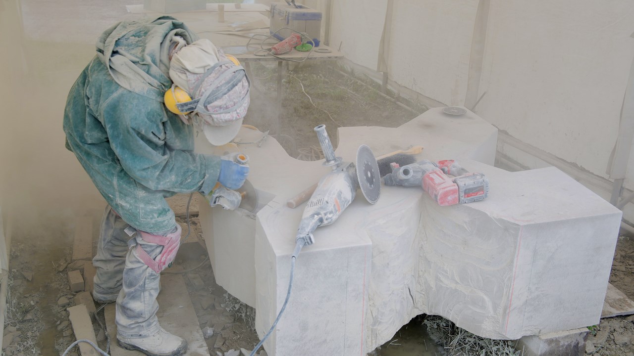 Les principaux outils utilisés dans la création de « l’Homoiseau » sont la disqueuse et le burin afin d’obtenir la forme désirée. Par la suite, lors de la finition, l’artiste fera usage d’une meuleuse qui absorbera à la fois la pierre en excédant.