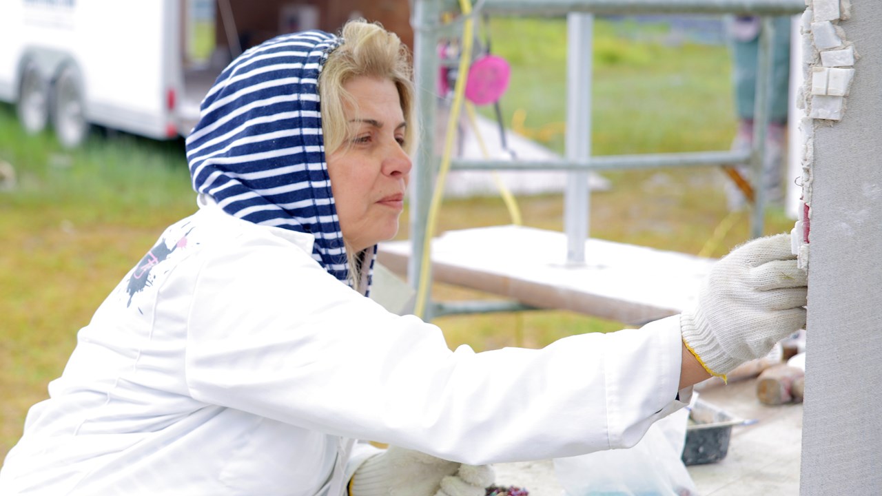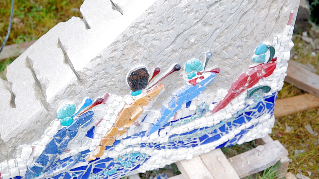 « Ça représente des personnes qui font du rafting. Ici il y a beaucoup de lacs, de cours d’eau, et ça m’a inspiré pour faire quelque chose de symbolique à ce sujet », explique-t-elle. Sa sculpture, une pierre imposante érigée à la verticale, a été travaillée puis ornée de roches colorées minutieusement découpées. Parmi celles-ci, on y retrouve le granite, le cristal, le marbre ainsi que des pierres semi-précieuses. La large palette de couleurs créée par cette mosaïque donne d’ailleurs un caractère particulier à l’œuvre de Tamina Saade. « Ce qui la diffère des autres sculptures, c’est les couleurs », indique-t-elle.