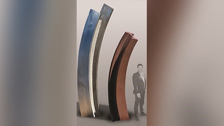 De cette matière brute en évolution, naît deux poutrelles; une en acier corten et l’autre en acier inoxydable. Matériaux diamétralement opposés s’il en est, ces profilés de métal, typiques de l’industrie, sont cependant singuliers puisque courbés et de dimensions dégressives.