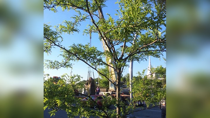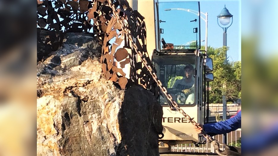 Voyez le transport de la sculpture jusqu'au lieu de son installation permanente en visionnant la vidéo ci-dessus.