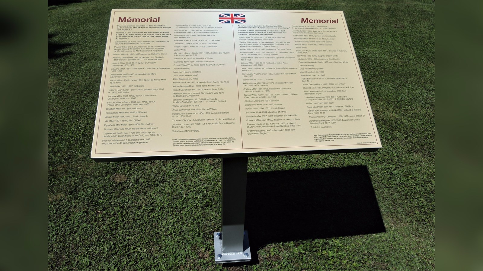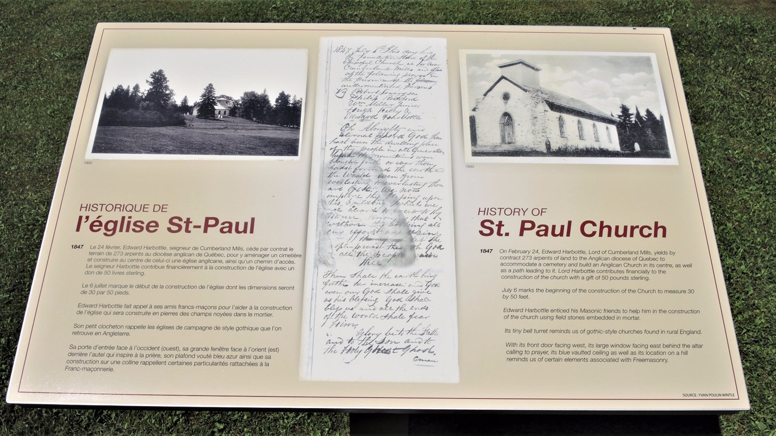 Neuf panneaux d'interprétation ont été installés dans le jardin Harbottle et deux à l'intérieur de l'église Saint-Paul de Cumberland Mills pour l'été 2017.