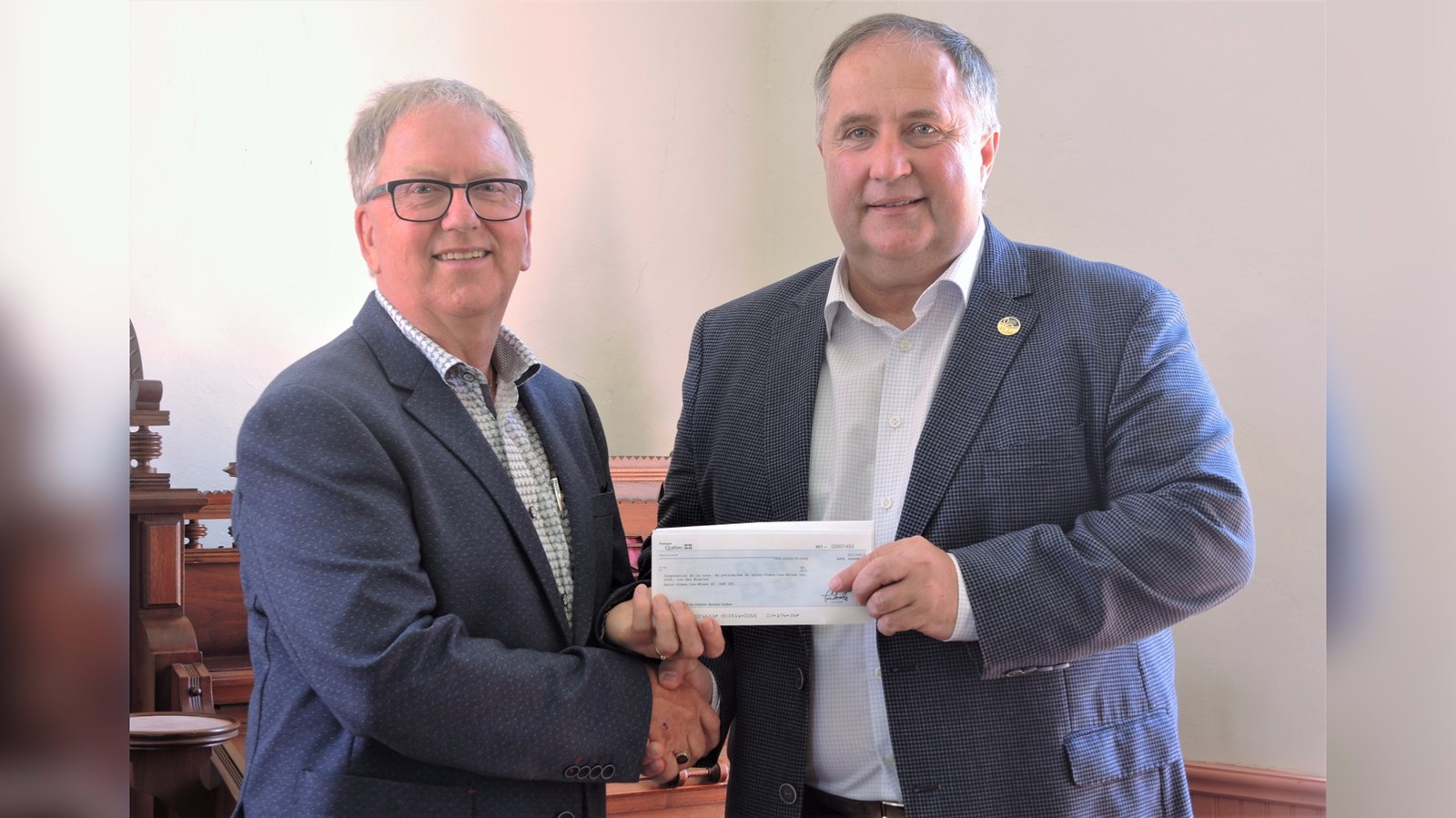 Yvan Poulin, président de la Corporation de conservation de Saint-Simon-les-Mines, accompagné du député de Beauce-Sud, Paul Busque, qui a remis un montant de 10 000 $ pour aider à l'amélioration du site du jardin Harbottle et de l'église Saint-Paul-de-Cumberland Mills.