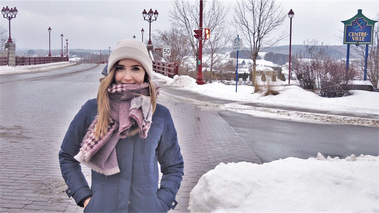 Jessie Nadeau à l'intersection de la Route Saint-Elzéar (Route 216) et de la Rue Notre-Dame, à Sainte-Marie, la municipalité où elle a grandi en Beauce.