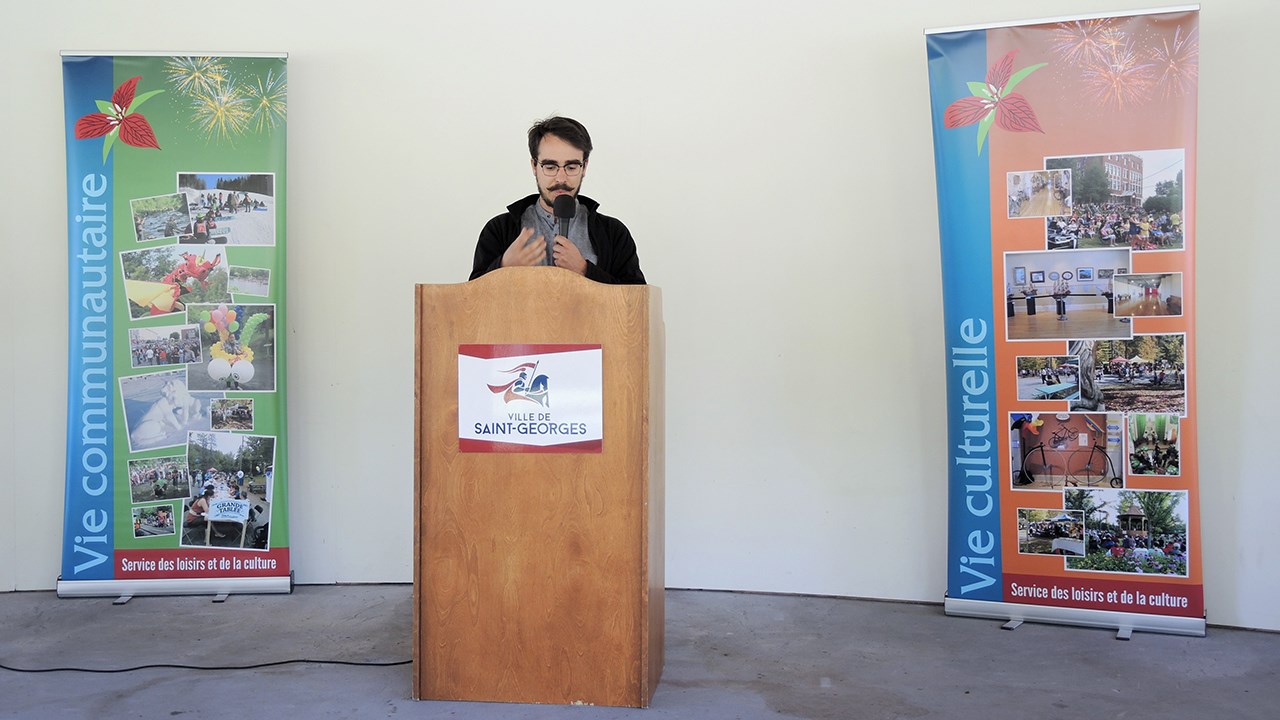 Samuel Duval, stagiaire au Service des loisirs et de la culture de la Ville de Saint-Georges, à la conférence de presse annonçant la programmation estivale 2018 au parc des Sept-Chutes de Saint-Georges, jeudi le 24 mai 2018.
