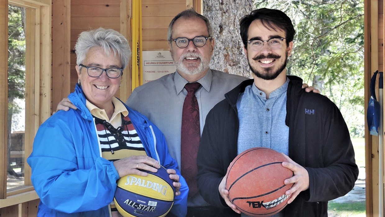 De gauche à droite : Dans le kiosque d'informations et de prêt de matériel se trouvent Carole Paquet, directrice du Service des loisirs et de la culture de la Ville de Saint-Georges, Claude Morin, maire de la Ville de Saint-Georges, et Samuel Duval, stagiaire au Service des loisirs et de la culture de la Ville de Saint-Georges, lors de la conférence de presse annonçant la programmation estivale 2018 au parc des Sept-Chutes de Saint-Georges, jeudi le 24 mai 2018.