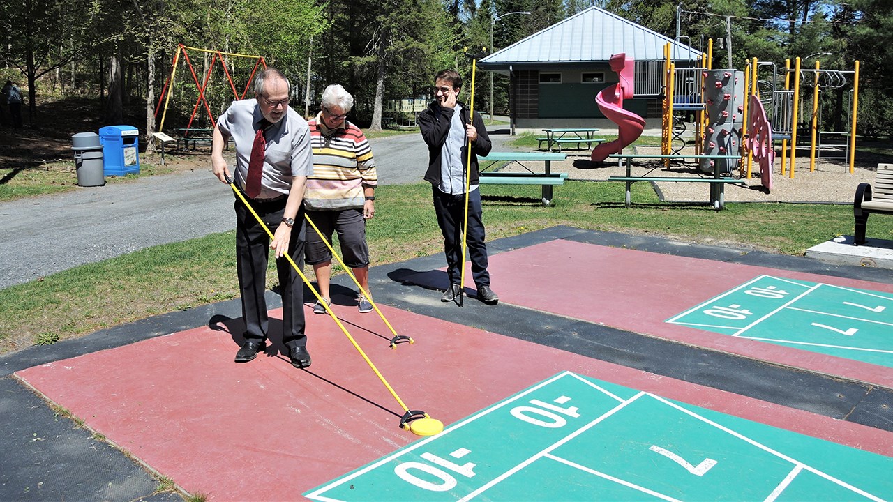 De gauche à droite : S'amusant sur les terrains de shuffleboard, Claude Morin, maire de la Ville de Saint-Georges, Carole Paquet, directrice du Service des loisirs et de la culture de la Ville de Saint-Georges, et Samuel Duval, stagiaire au Service des loisirs et de la culture de la Ville de Saint-Georges, De gauche à droite : Carole Paquet, directrice du Service des loisirs et de la culture de la Ville de Saint-Georges, Claude Morin, maire de la Ville de Saint-Georges, et Samuel Duval, stagiaire au Service des loisirs et de la culture de la Ville de Saint-Georges, lors de la conférence de presse annonçant la programmation estivale 2018 au parc des Sept-Chutes de Saint-Georges, jeudi le 24 mai 2018.