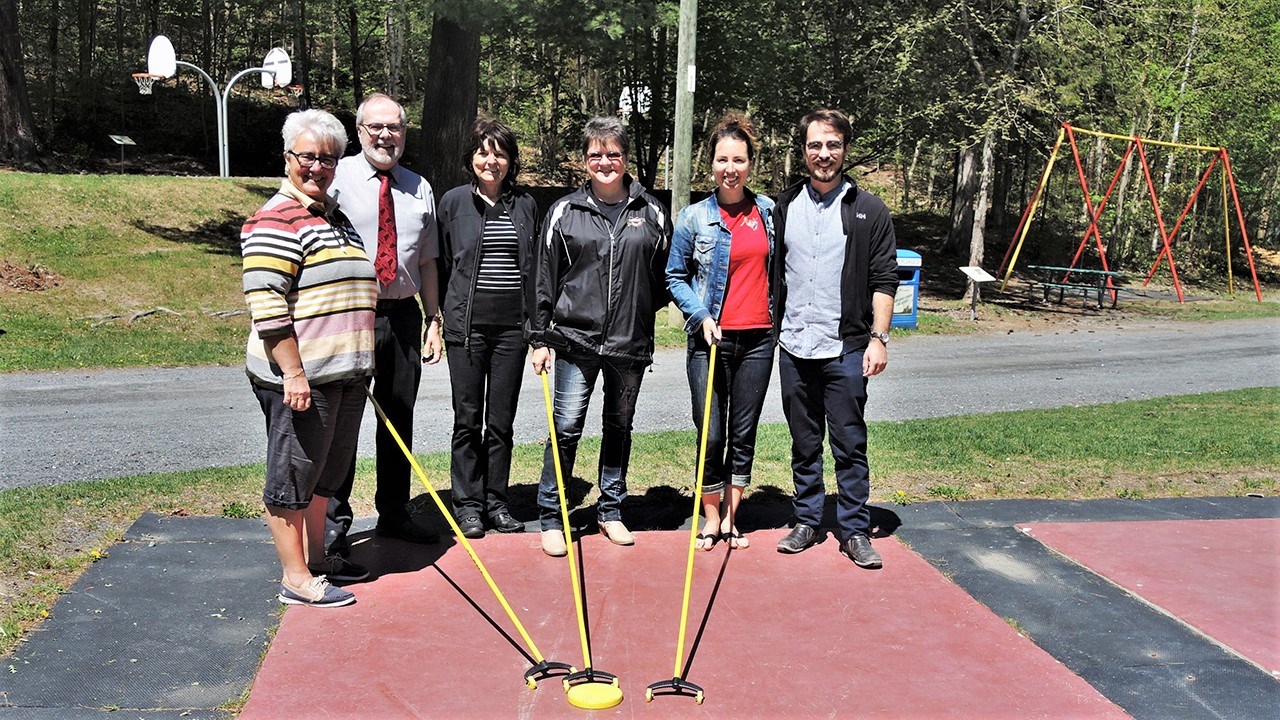 De gauche à droite : Sur les terrains de shuffleboard, Carole Paquet, directrice du Service des loisirs de la Ville de Saint-Georges, Claude Morin, maire de la Ville de Saint-Georges, Johanne Veilleux, du Groupe des ornithologues de la Beauce-Etchemin, Sylvie Roy, de Country Dance S.R., Virginy, de la Cabane à Swing, et Samuel Duval, stagiaire au Service des loisirs et de la culture de la Ville de Saint-Georges, lors de la conférence de presse annonçant la programmation estivale 2018 au parc des Sept-Chutes de Saint-Georges, jeudi le 24 mai 2018.