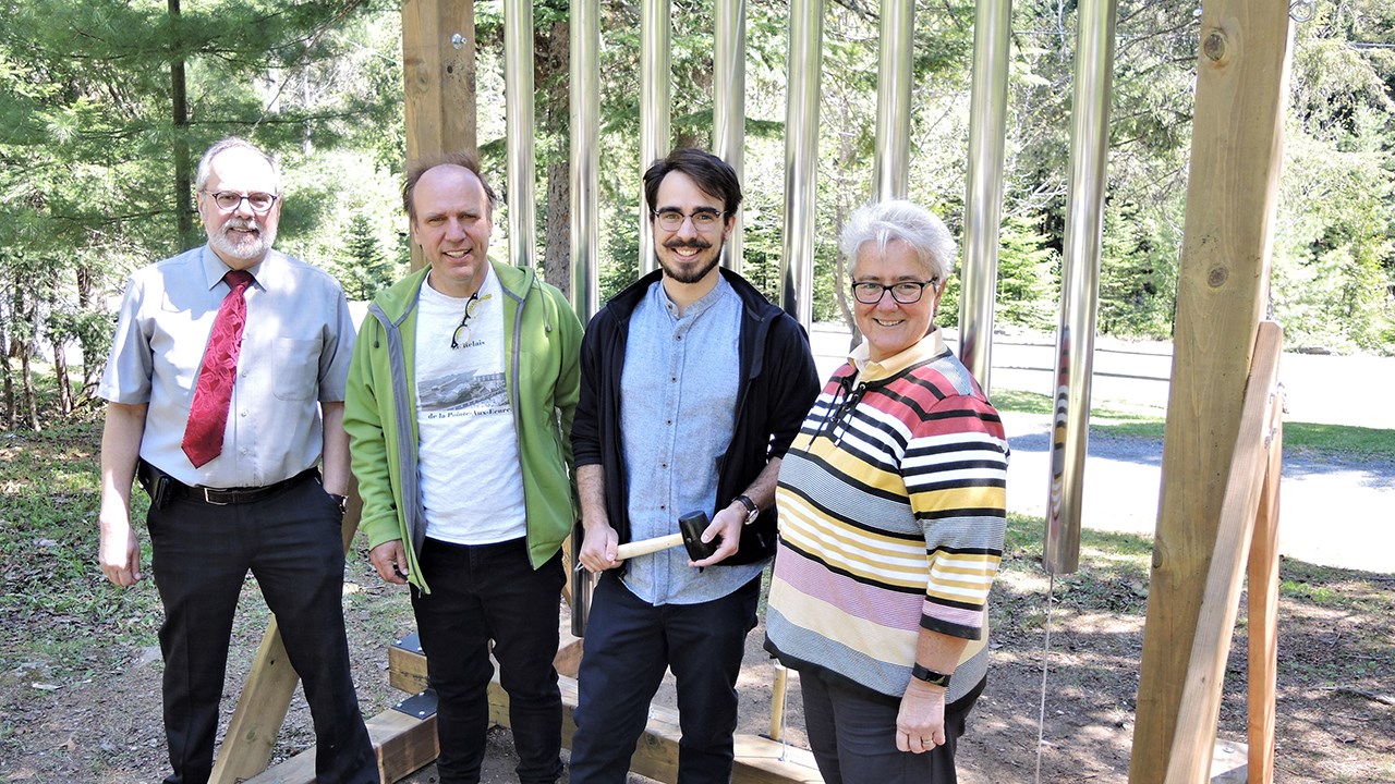De gauche à droite : Devant le xylophone géant, installé près de la piste cyclable, Claude Morin, maire de la Ville de Saint-Georges, Marc Duval, de Général Patente, Samuel Duval, stagiaire au Service des loisirs et de la culture de la Ville de Saint-Georges et Carole Paquet, directrice du Service des loisirs et de la culture de la Ville de Saint-Georges, lors de la conférence de presse annonçant la programmation estivale 2018 au parc des Sept-Chutes de Saint-Georges, jeudi le 24 mai 2018.
