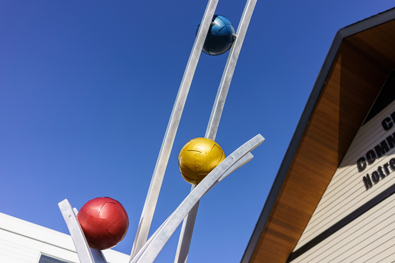Ainsi, la réalisation en aluminium, mesurant 14 pieds (4,27m) de haut, fait écho aux architectures environnantes et symbolise le côté ludique du Centre communautaire. Ils sont donc allés chercher les couleurs primaires pour les sphères, le bleu, le jaune et le rouge, pour l’idée du jeu et de l’enfance.