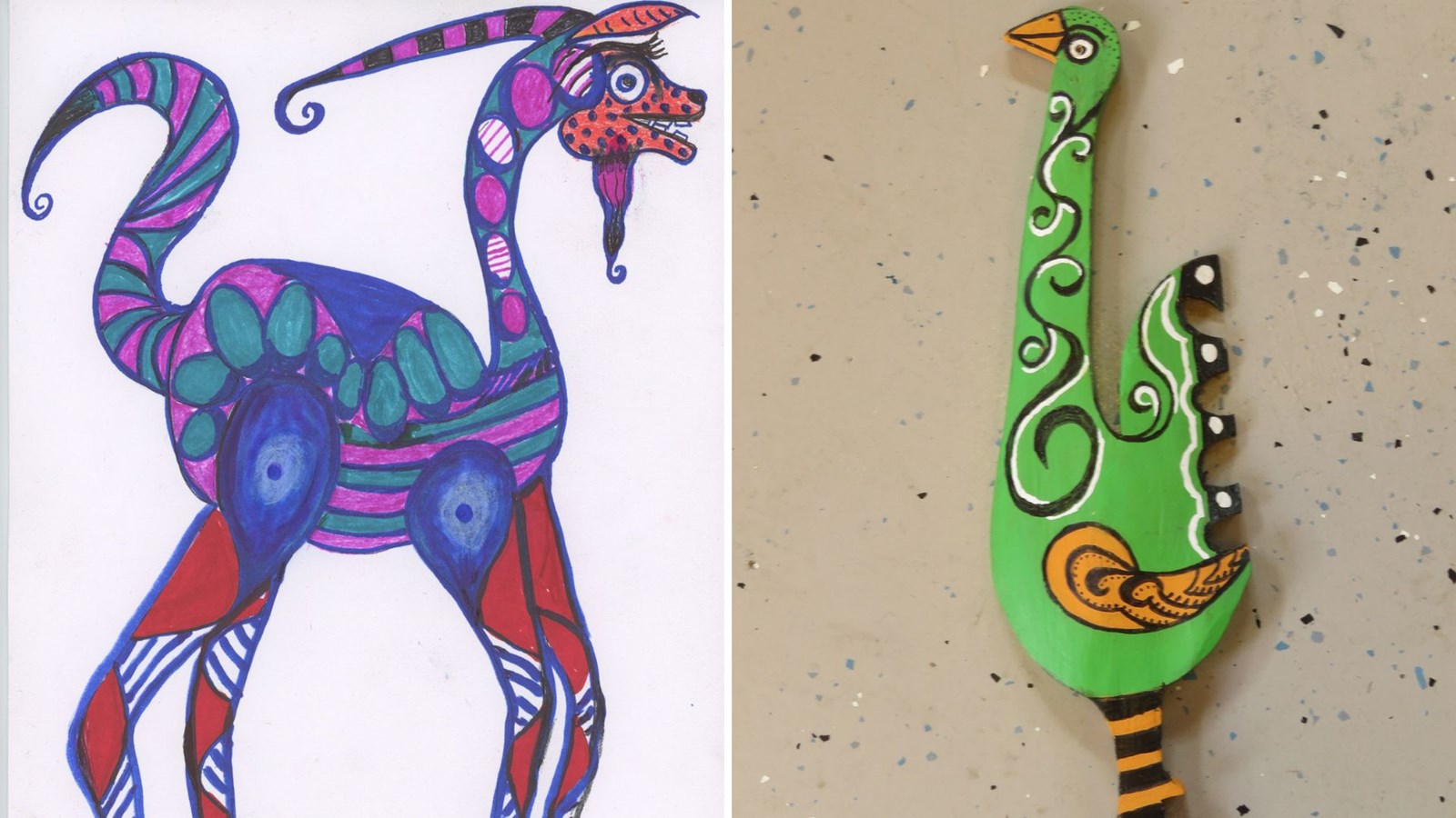 Vous pouvez contempler ses dessins pleins de vie, de fantaisie et de vérité. Des oiseaux, des petits garnements, des animaux imaginaires, etc. Des objets percutants réalisés avec des matériaux recyclés sauront aussi vous surprendre : des objets inusités suspendus, des fleurs en métal blanc de cannes de conserve, un corbillard non macabre, des personnages, des têtes, des sculptures, des chevaux en feuilles de métal.