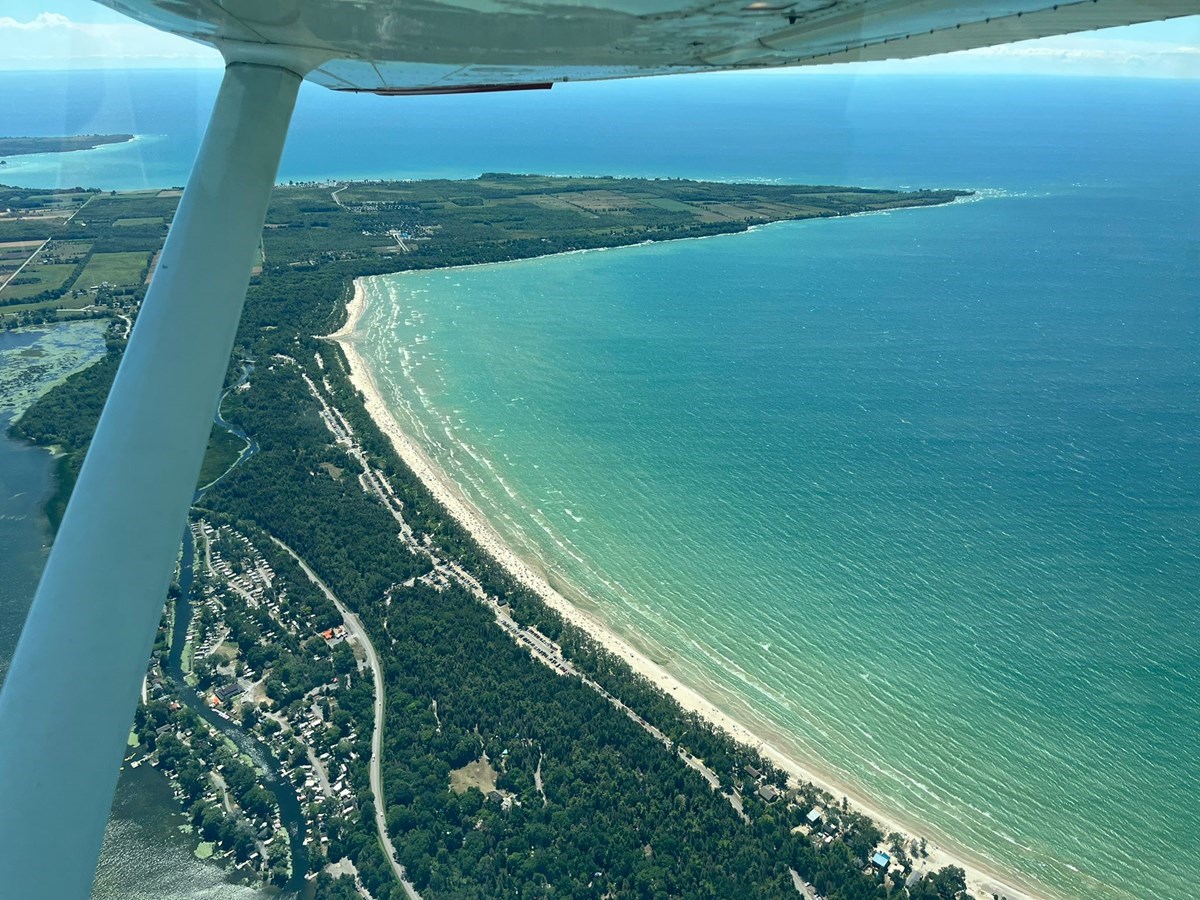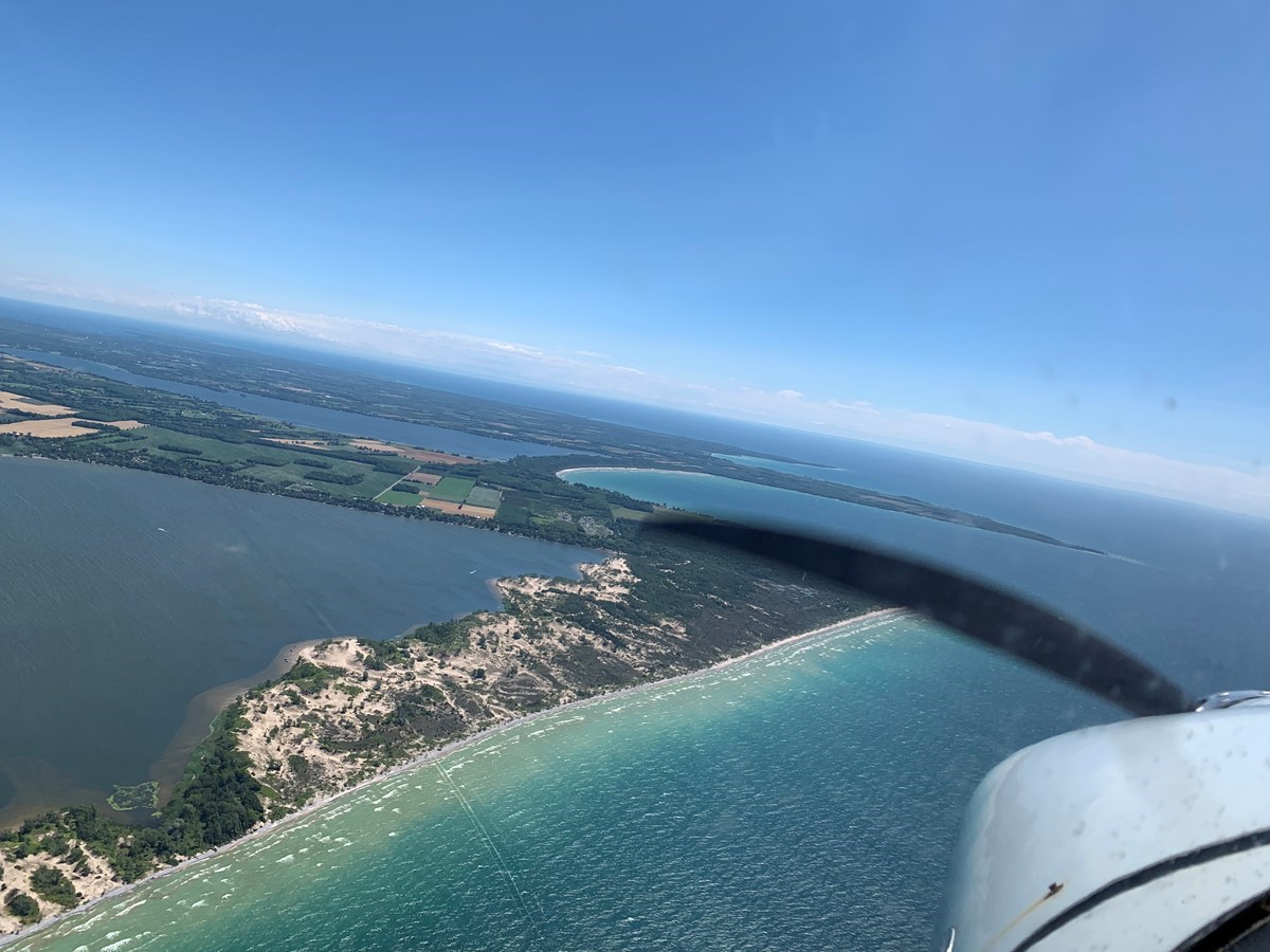 Sandbanks, vu d’un Cessna 182 (2 femmes pilotes) en route pour le dîner à Picton.