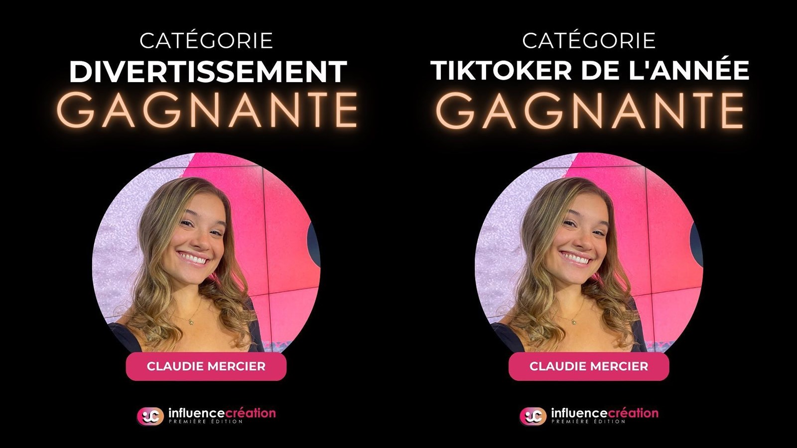 Nominée dans trois catégories, Claudie Mercier a finalement remporté deux prix lors du Gala InfluenceCréation, l'un dans la catégorie Divertissement, l'autre comme Tiktoker de l'année.