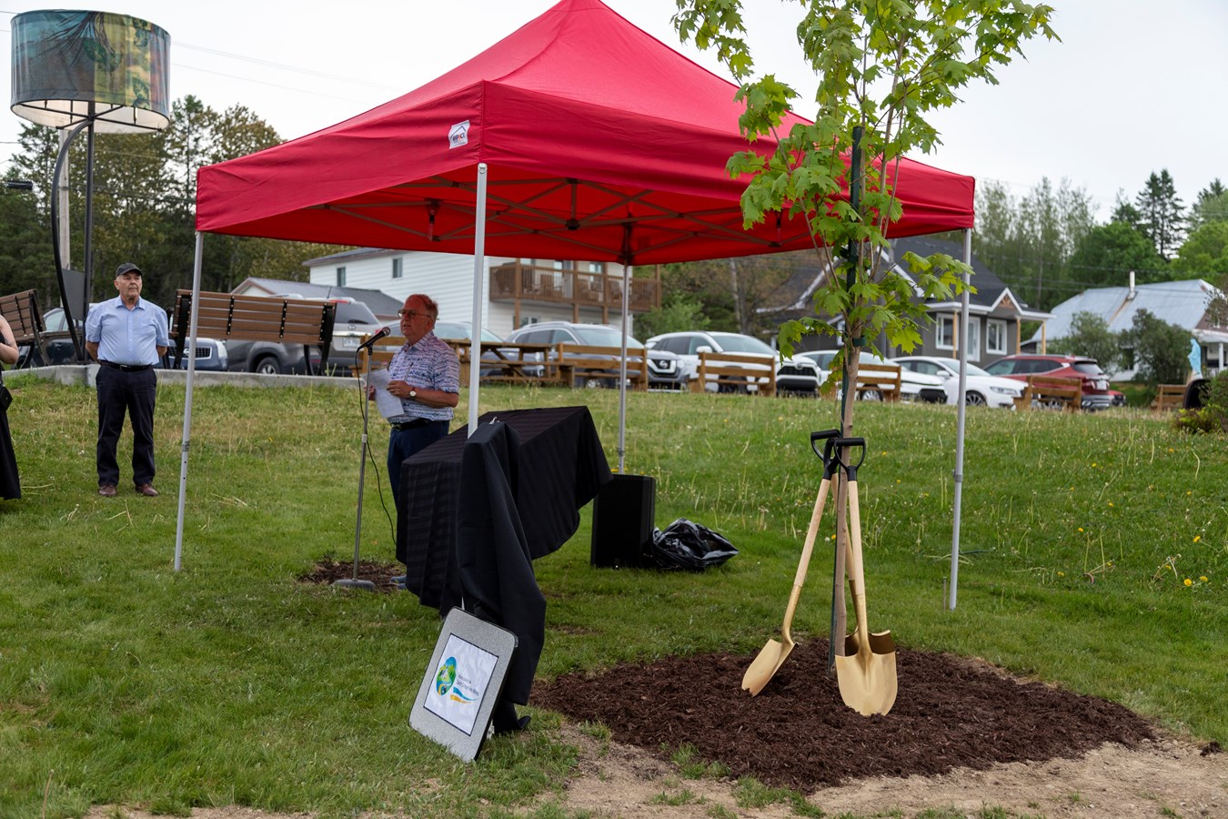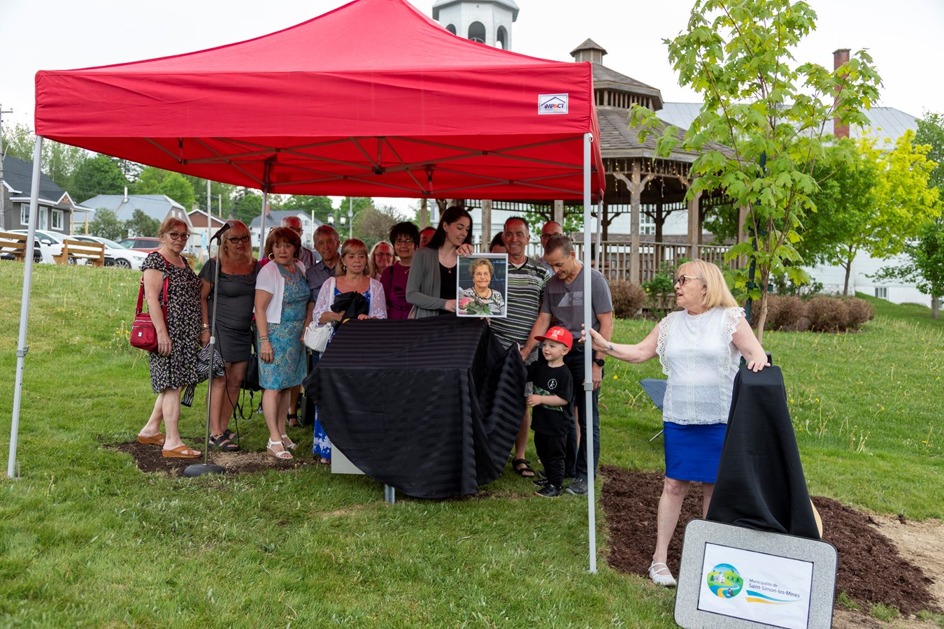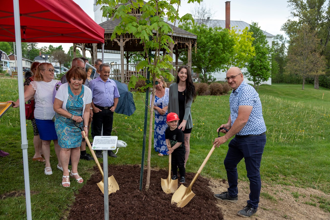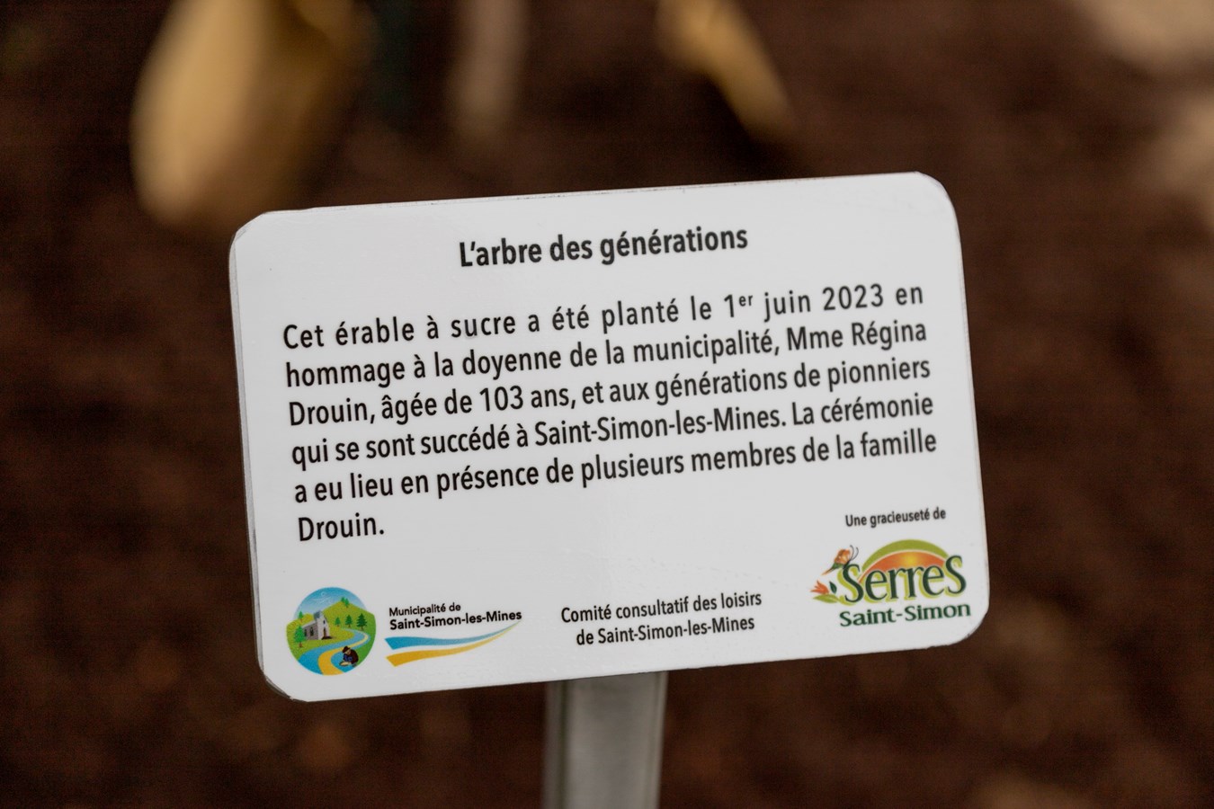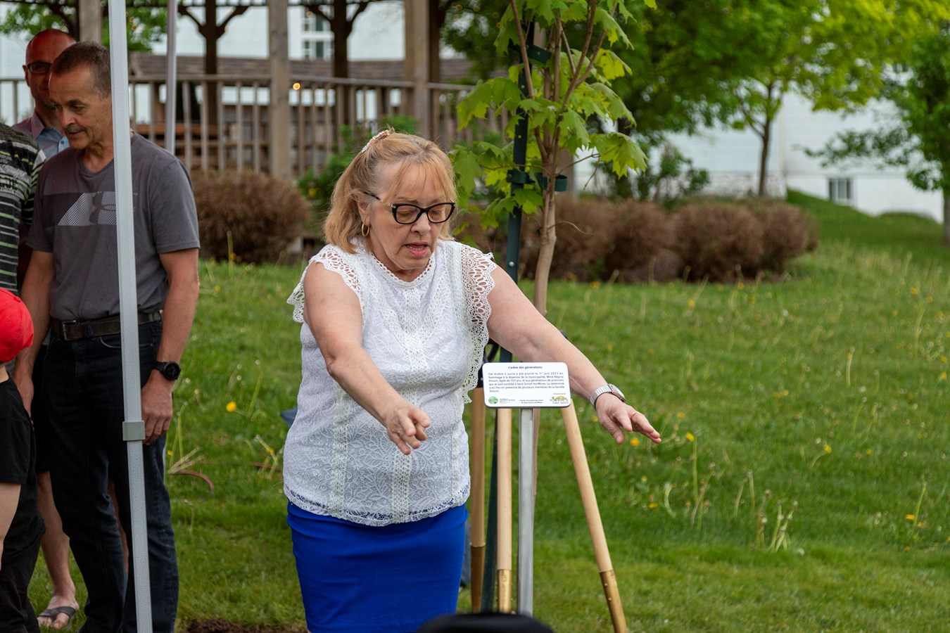 L'arbre rend hommage à la centenaire, Mme Régina Drouin, qui est âgée de 103 ans. Il s'agit notamment de la doyenne de la municipalité et elle était entourée de sa famille pour l'occasion.