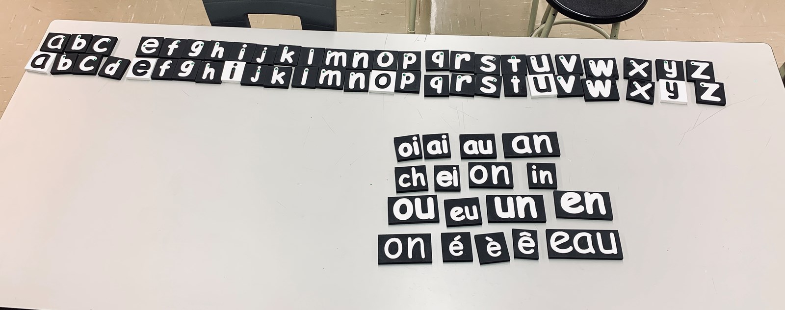 - Des lettres et des sons gravés et peinturés permettant aux élèves de la classe COM de manipuler et de toucher la lettre en passant le doigt dans la gravure.