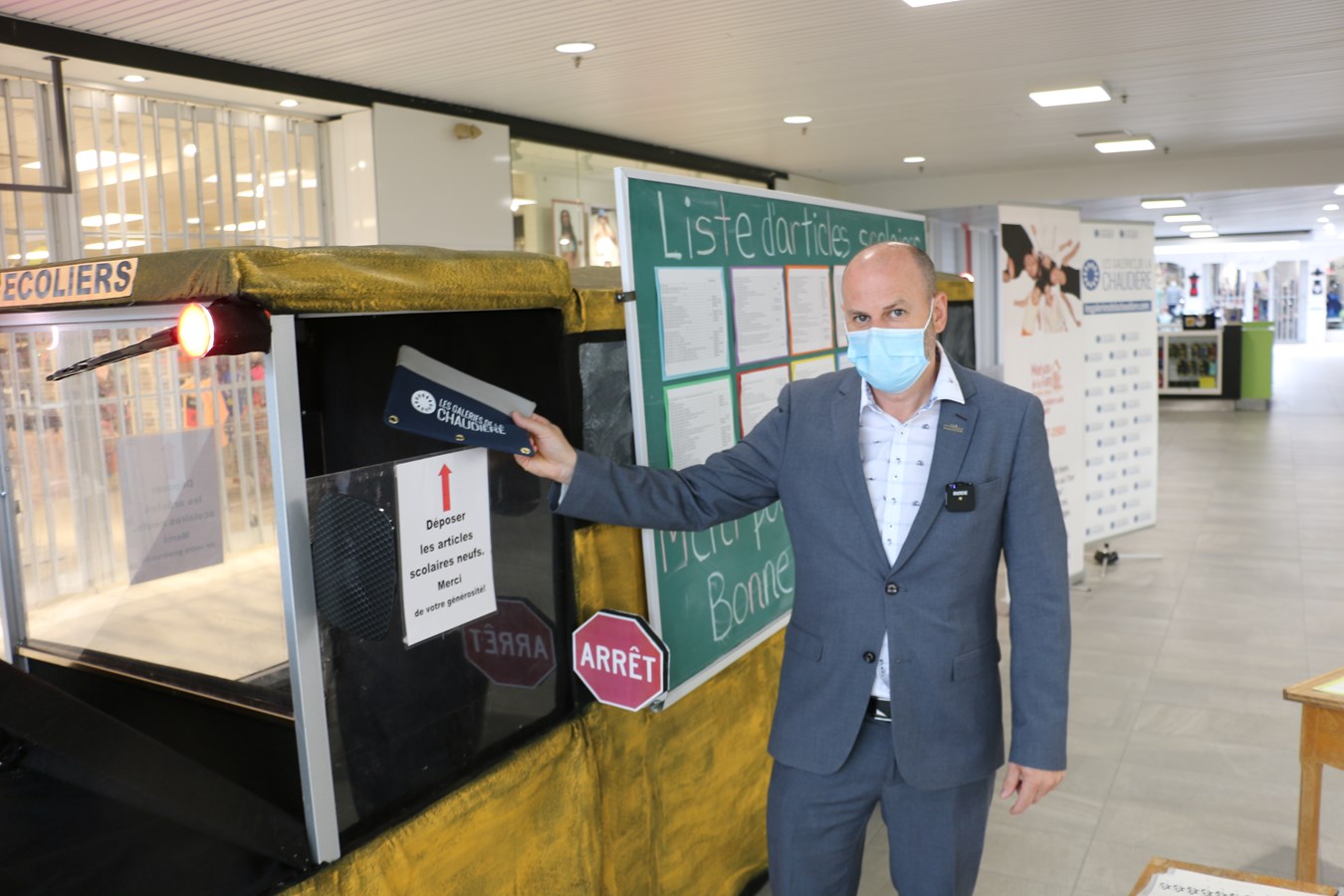 Les Galeries de la Chaudière à Sainte-Marie, en association avec La Maison de la Famille Nouvelle-Beauce et Centre de Pédiatrie Sociale, ont installées ce matin leur autobus scolaire dans le hall près du Dollarama afin de récolter à nouveau des articles scolaires pour des familles dans le besoin.
