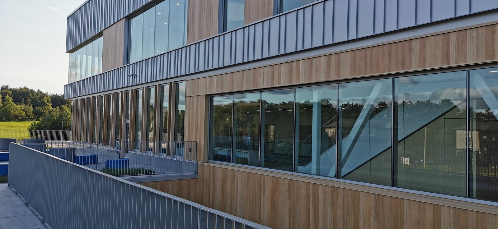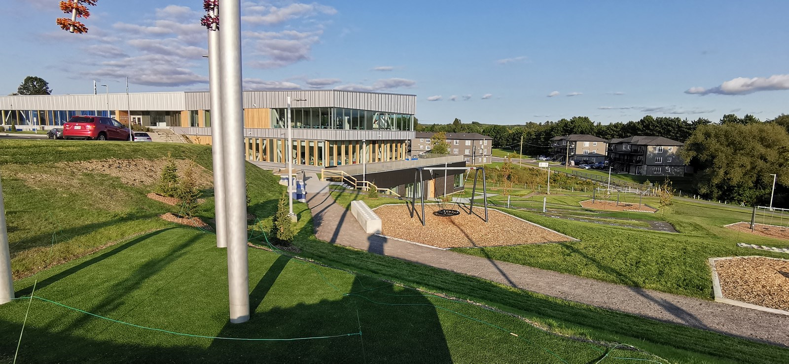 Quant au terrain, donné par la municipalité de Scott comme contribution au projet, celui-ci a été aménagé pour offrir des modules de jeux, des espaces pour les jeux de ballon, un sentier pédestre et une classe extérieure. Le projet de 26 M$ a été entièrement financé par le ministère de l’Éducation.