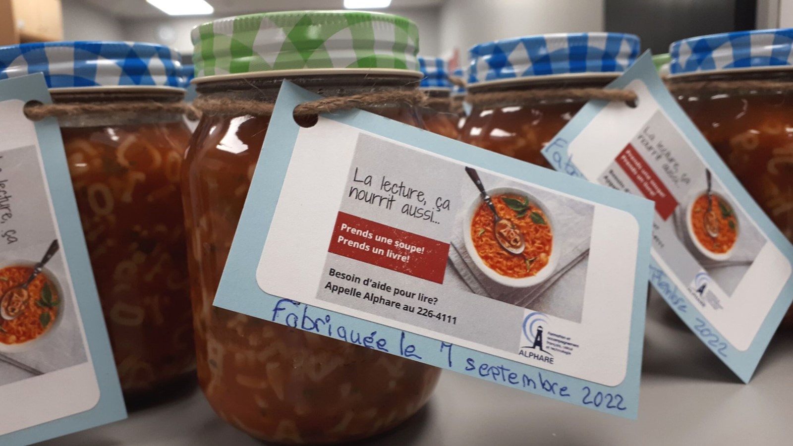 « C’est dans cet esprit d’inclusion que l’équipe d’Alphare a décidé de se rendre sur le terrain pour faire connaître ses services. Dans le but de nourrir ceux qui en ont besoin, 20 pots de soupe à l’alphabet ont été cuisinés avec la collaboration du Pavillon du cœur Beauce-Etchemin, qui nous ont gracieusement prêté leur cuisine. Ces pots de soupe ont été déposés dans les 4 frigos communautaires de Saint-Georges. Du même coup, des livres y ont aussi été laissés pour rappeler aux gens que « La lecture, ça nourrit aussi! ». Ainsi, un faible niveau de scolarité entraîne souvent de la pauvreté et celle-ci augmente aussi le risque de vivre avec des difficultés de littératie. C’est pour briser ce cycle que nous invitons les gens à venir cogner à notre porte, pour apprendre à lire, écrire, comprendre, compter et utiliser les nouvelles technologies. », de mentionner la directrice, Annie Poulin.