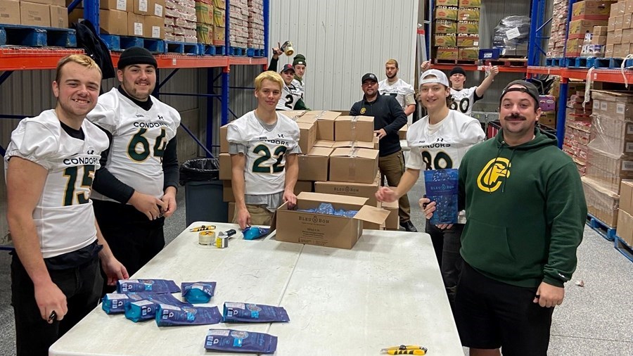 De leur côté, les Condors du Cégep Beauce-Appalaches ont également donné de leur temps à l’organisme Moisson Beauce. Grâce à ce temps passé à l’activité d’emballage chez MÉTRO Laval Veilleux, les Condors hockey ont pu remettre un chèque de 685 $ à Isabelle Lessard, directrice philanthropie, communications et événements de Moisson Beauce. À leur tour, les Condors football se sont réunis chez Moisson Beauce dans la section entrepôt pour faire du tri d’aliments et du classement en plus de monter 400 boîtes servant à la confection de paniers de Noël. Ces derniers y retourneront prêter main-forte après les fêtes. Cette saison, nos deux équipes sportives auront aussi dédié l’un de leurs matchs au profit de l’organisme d’aide alimentaire en récoltant plusieurs caisses de denrées non périssables en échange d’une entrée gratuite.