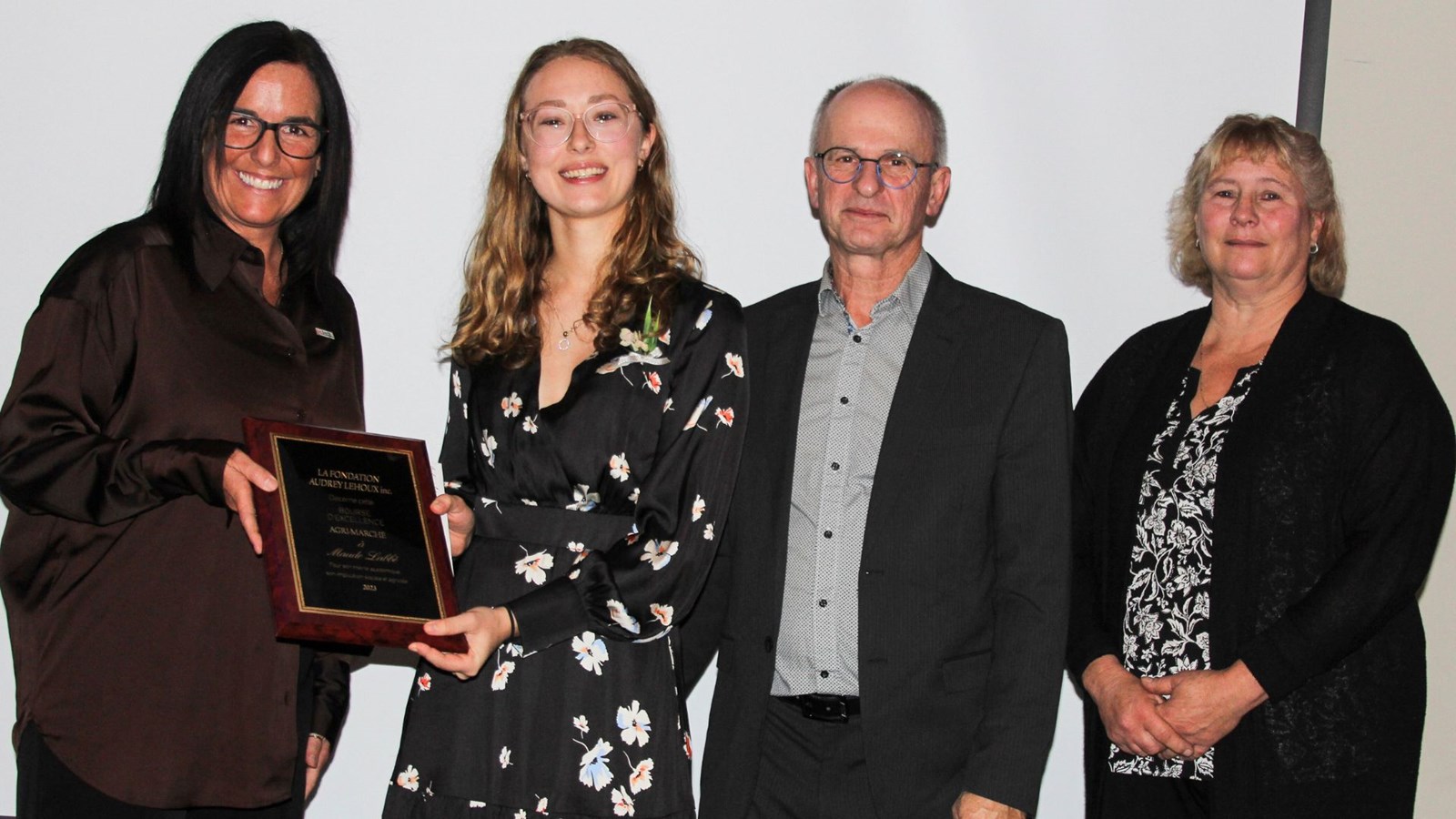 Geneviève Gauthier, de Agri-Marché, remet la bourse d'Excellence à Maude Labbé, en compagnie de Germain Lehoux et Claire Ouellet.