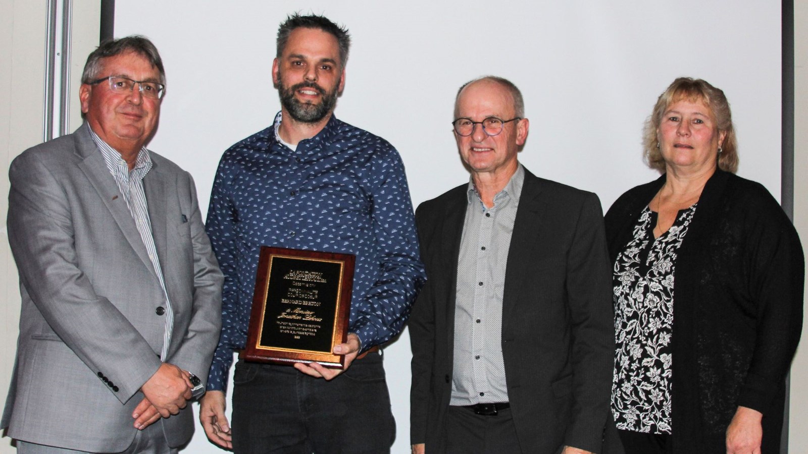Raymond Breton remet le prix «Coup de Coeur - Bernard Breton» à Jonathan Lehoux, en compagnie de Germain Lehoux et Claire Ouellet.
