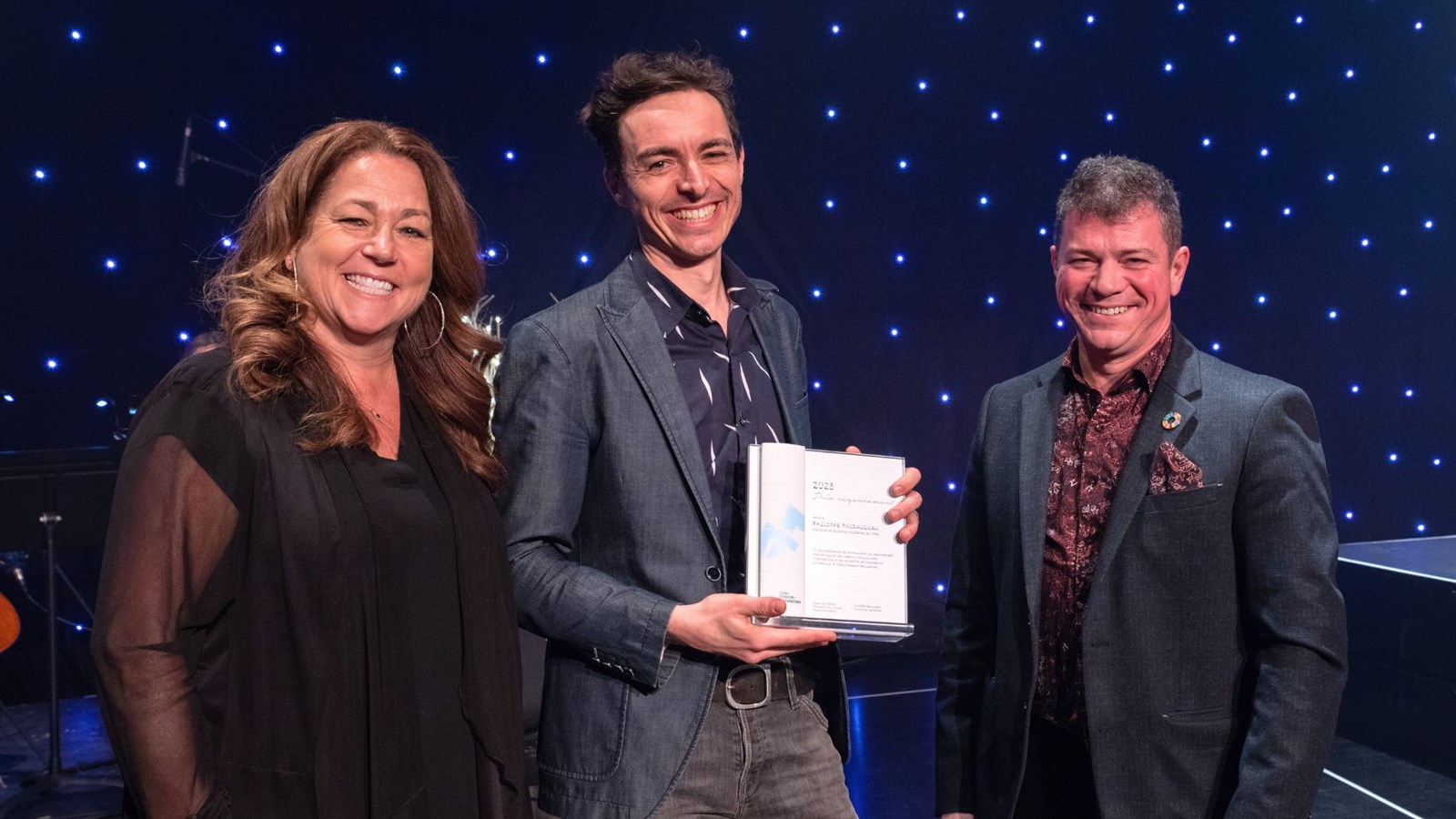 Le prix Rayonnement 2023 est allé à Philippe Thibaudeau. La remise a été effectuée par Caroline Bouchard et François Giroux, respectivement directrice générale et président du conseil d'administration du Cégep Beauce-Appalaches.