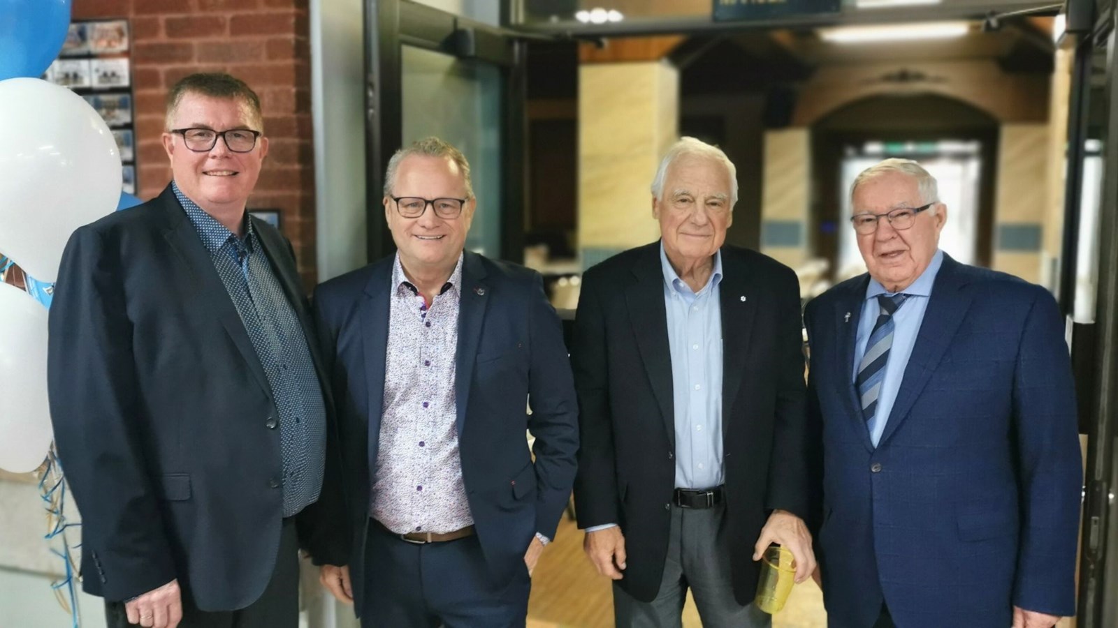 Au centre, les co-présidents de la campagne de financement, Michel Bernard et Marcel Dutil, en compagnie du président de la Fondation de l'EJM de Beauceville, Michel Vallée, et du président de la Corporation du Petit séminaire de Saint-Georges, l'abbé Laval Bolduc.