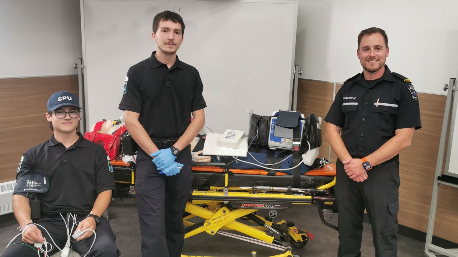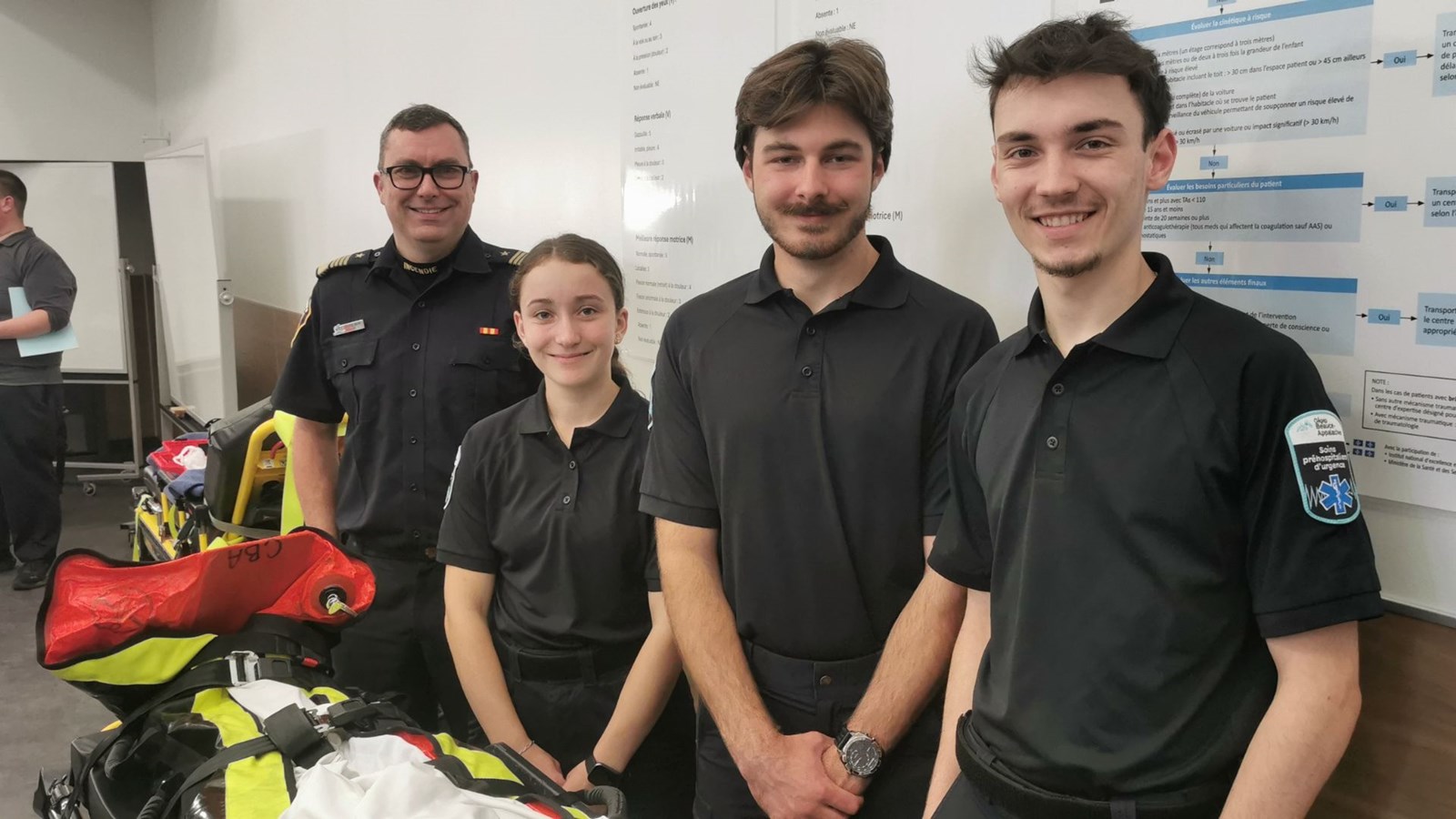 À droite, Jean-Philippe Mercier, coordonnateur du programmes de Soins préhospitaliers d’urgence (SPU), en compagnie des étudiants Loïc Brochu, et Rhéaume Bilodeau.
