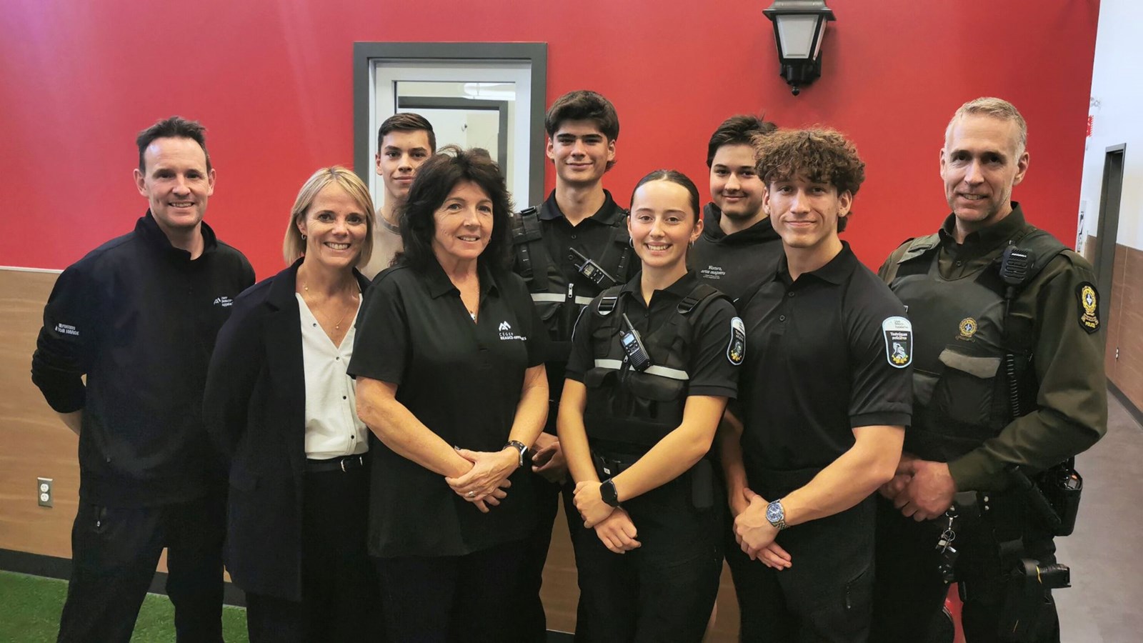 Programme de Techniques policières: première rangée, de gauche à droite, Daniel Jacob, enseignante, Nathalie Vachon, coordonnatrice du programme, Léa Vallée et Marech Panneton, étudiants; 2e rangée, Jean-Pierre Caron, enseignant, Mathieu Boutin, Édouard Mercier et Alexis Leblond, étudiants, ainsi que l'agent Pascal Mathieu, de la Sûreté du Québec.