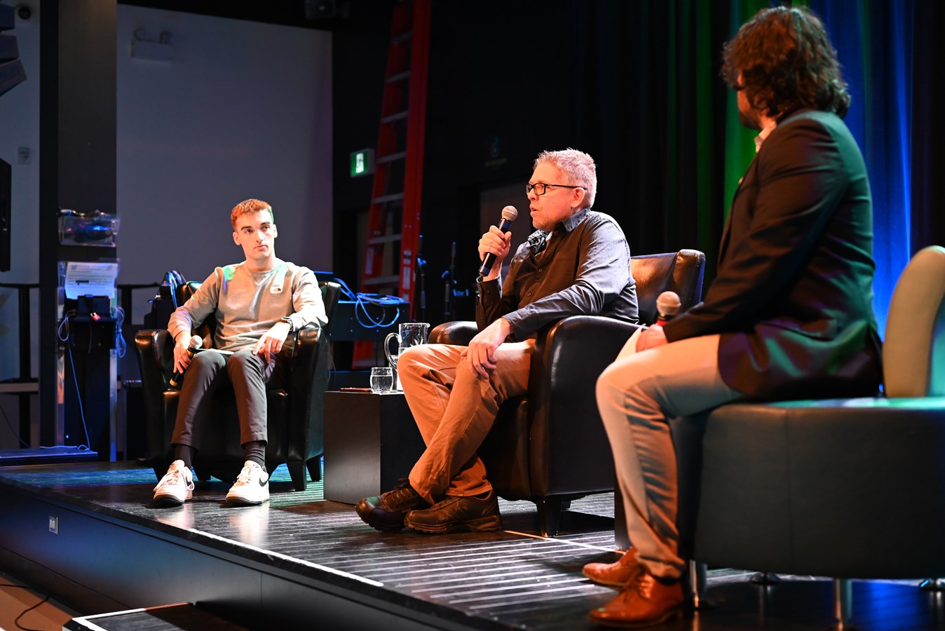 Conférence de Stéphane Turmel de Beaucinox Inc., accompagné de l'animateur Charles Charles-Philippe Rodrigue, conseiller à la vie étudiante, entrepreneuriat et développement durable au Cégep Beauce-Appalaches