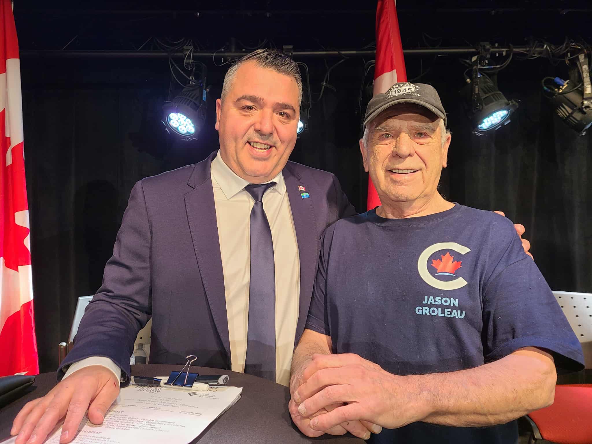 — Le candidat du Parti conservateur du Canada, Jason Groleau, n'était pas peu fier de compter sur la présence de son père, Jean-Marc, lors du débat du 17 avril, organisé par le Chambre de commerce de Saint-Georges, au campus de Saint-Georges du Cégep Beauce-Appalaches. Même chose pour le paternel qui ne s'est pas gêné pour afficher ses couleurs politiques!