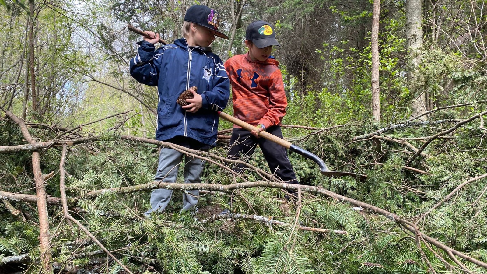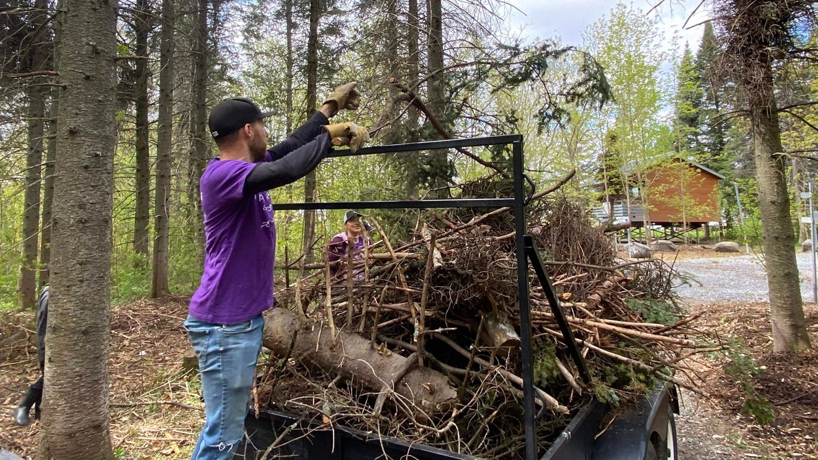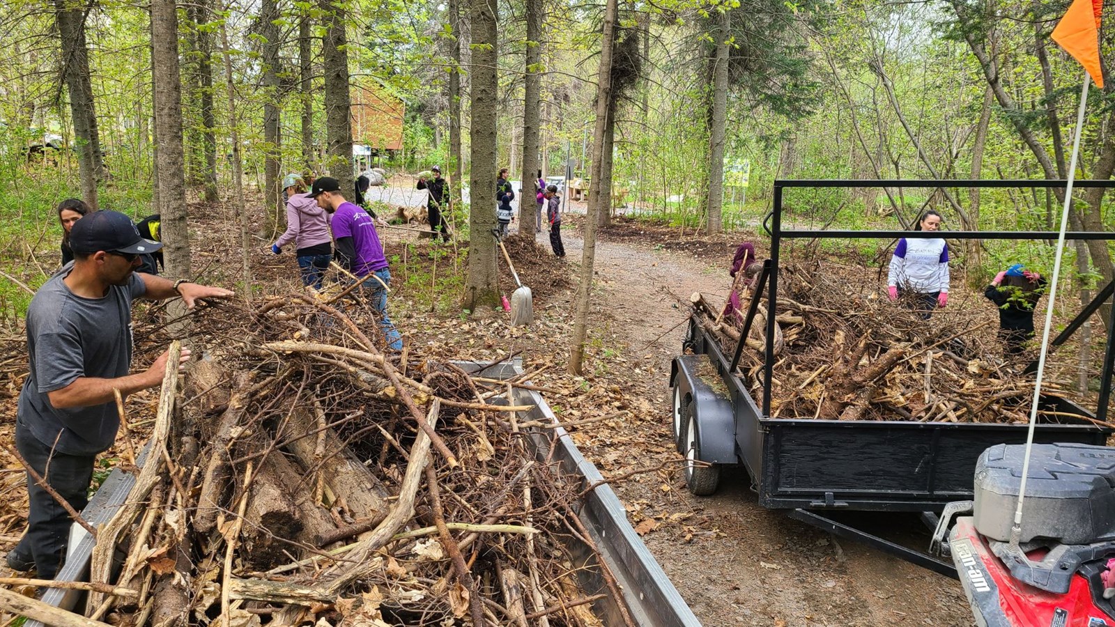 Le ramassage des branches permet maintenant d’offrir une zone familiale accueillante à l’entrée du parc et l’étalage de paillis contribue à la régénération du sol. Au total, 10 godets de pelles en paillis de cèdre ont été déchargés et étendus sur les sols alors que 20 remorques de 4' x 8' ont été nécessaires pour sortir les branches de la forêt.