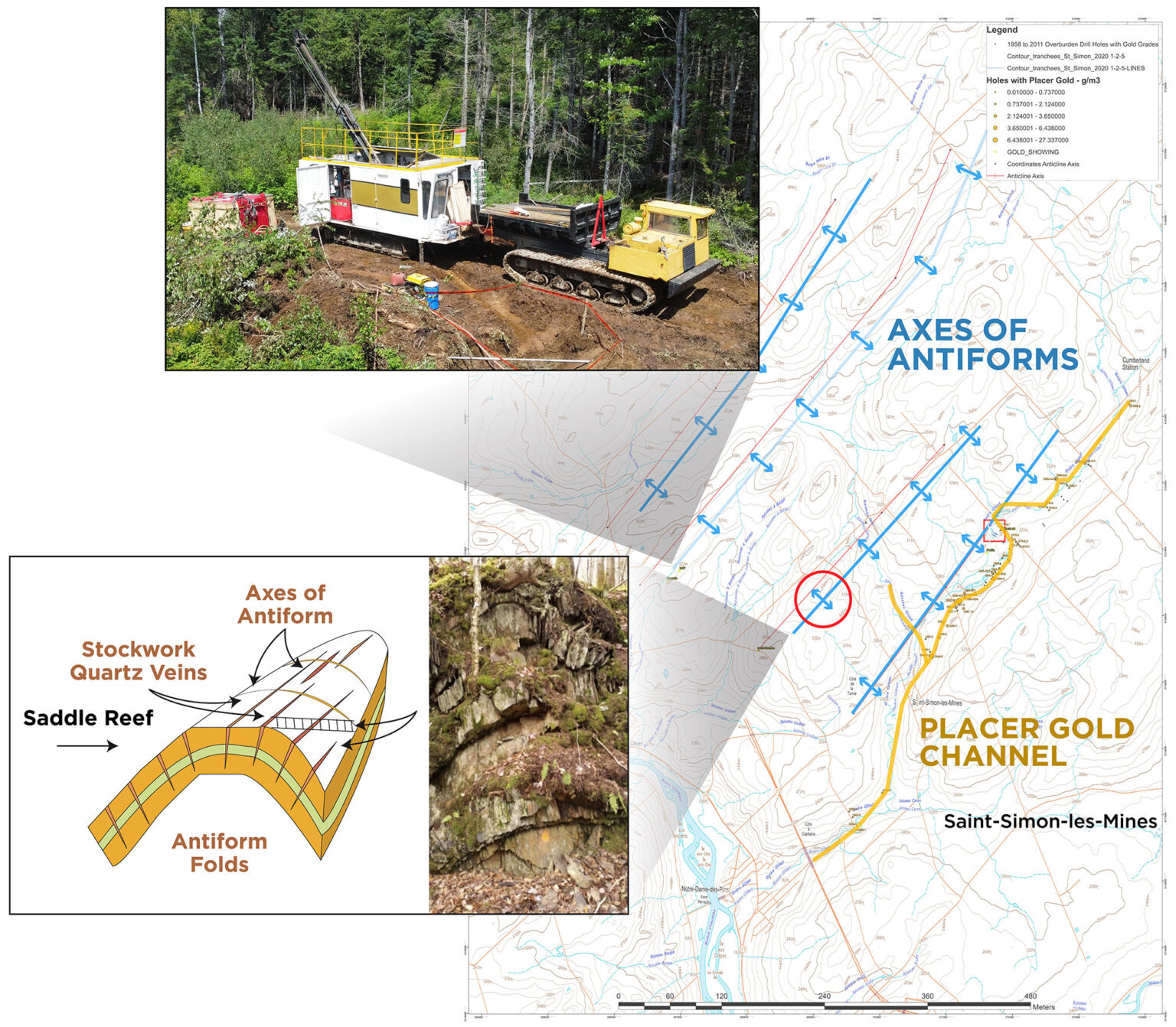 - Identification d'une structure prometteuse qui pourrait être l'une des sources et qui aurait hypothétiquement alimenté les placers aurifères de Saint-Simon-les-Mines.