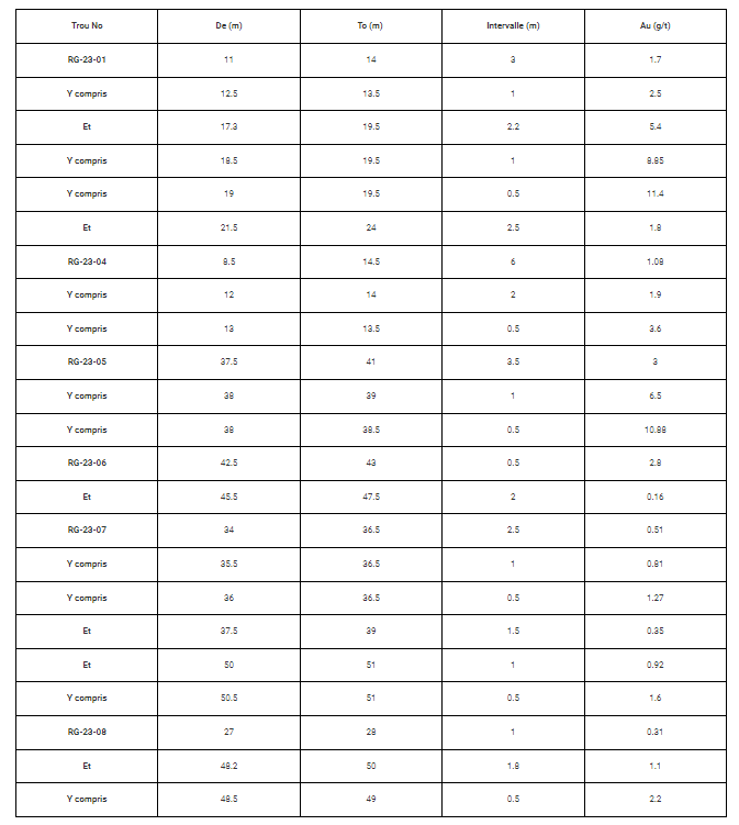 Les sondages GR 23-05 et 06 ont été orientés de manière à former un ciseau (coupe transversale) en atteignant la profondeur des trois premiers sondages. Le sondage RG 23-05 a trouvé la zone principale à environ 25 mètres au sud-est de la zone RG 23-01 et à environ 40 mètres verticalement sous la surface. Selon notre interprétation, la zone minéralisée titrant 3 g/t Au sur 3,5 m correspondrait à l'épaisseur réelle de cette zone.