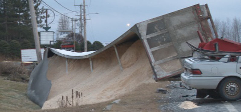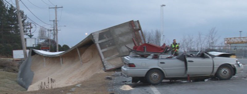 Selon la version du conducteur du camion, un chien à l’intérieur de l’automobile aurait pu distraire la conductrice tout juste avant l’impact. Le conducteur du camion n’a pas été blessé bien que son camion ait terminé sa course dans le fossé avant de se renverser. La route 204 a été fermée à la circulation à la hauteur de l’usine Canam pendant plusieurs heures, le temps de refaire la scène de l’accident et récupérer le bran de scie contenu dans la remorque.