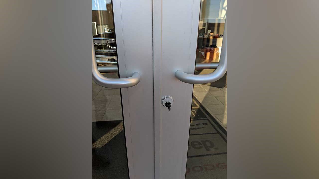 Alors qu'ils se préparaient pour un rassemblement « Meet SRT », les employés de Kennebec Dodge Chrysler ont eu de la difficulté à entrer dans le bâtiment du concessionnaire, c'est le moins qu'on puisse dire. À leur arrivée, les portes étaient vandalisées. Heureusement, grâce à une programmation liée à son véhicule, un employé a été en mesure d'ouvrir une porte de garage.