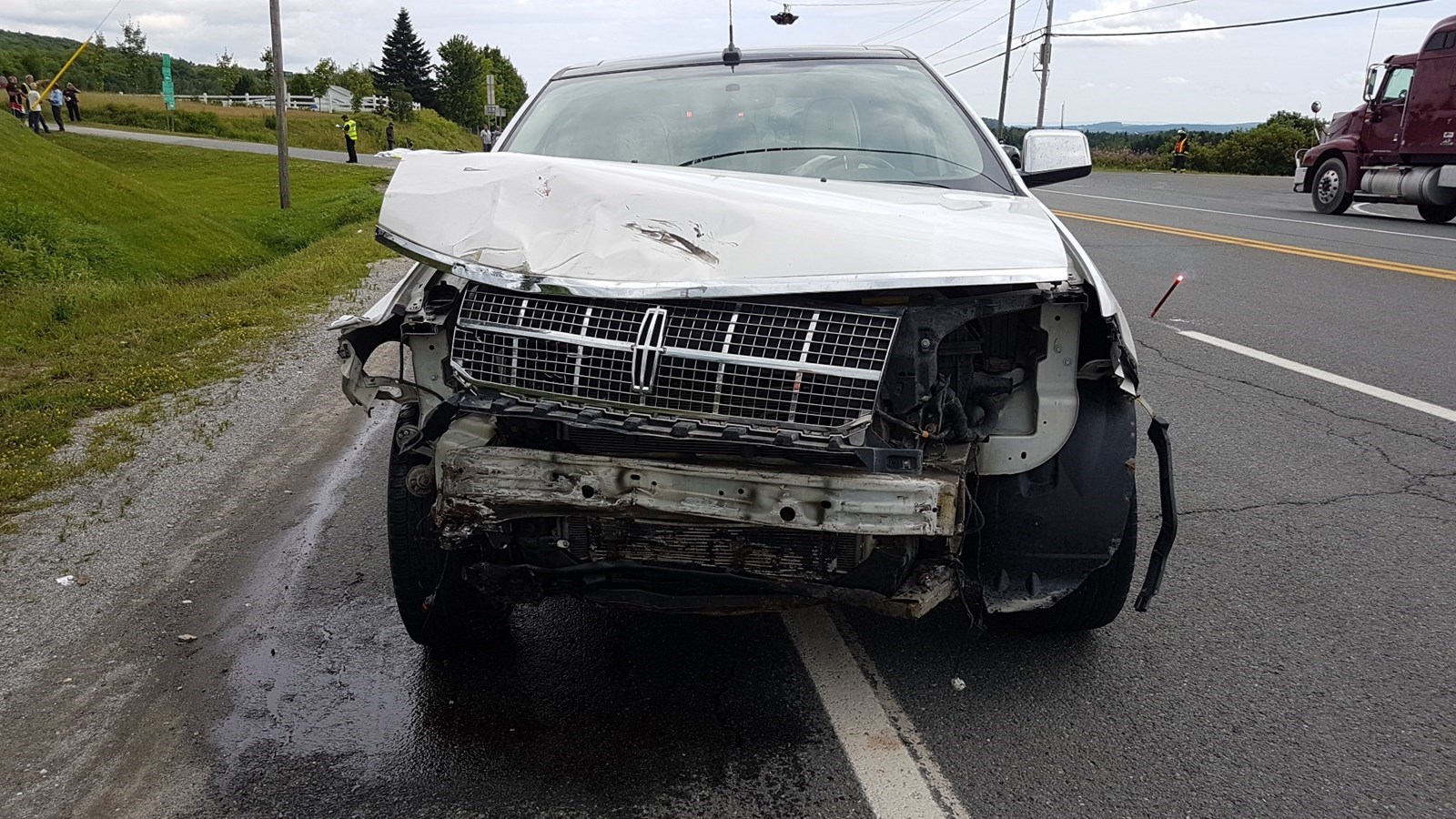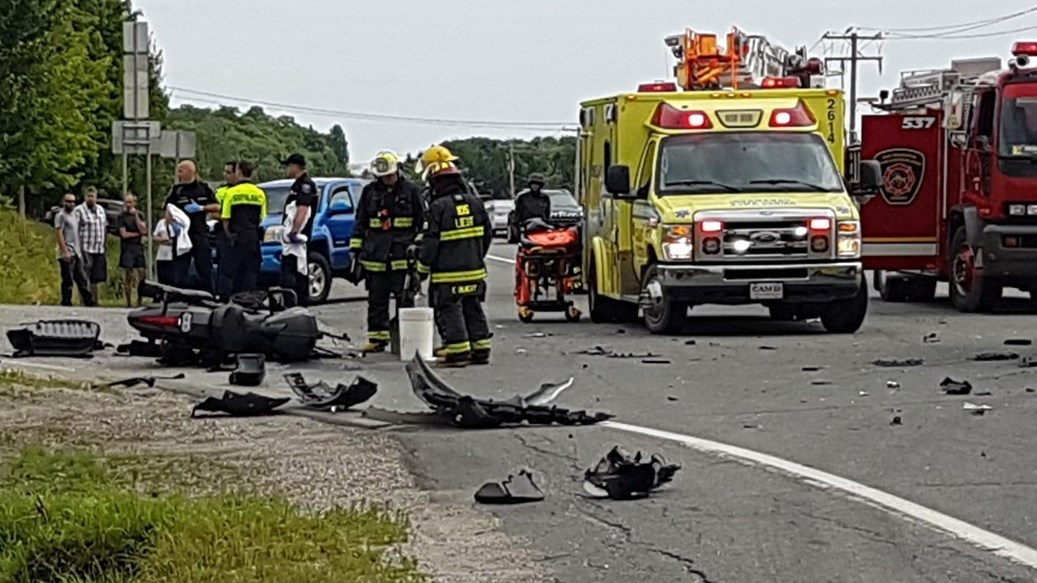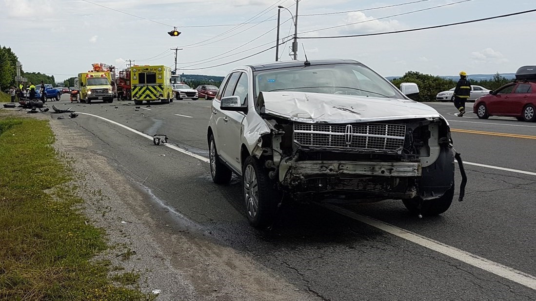 La moto a été sectionnée en deux et la voiture en cause a subi plusieurs dommages.
