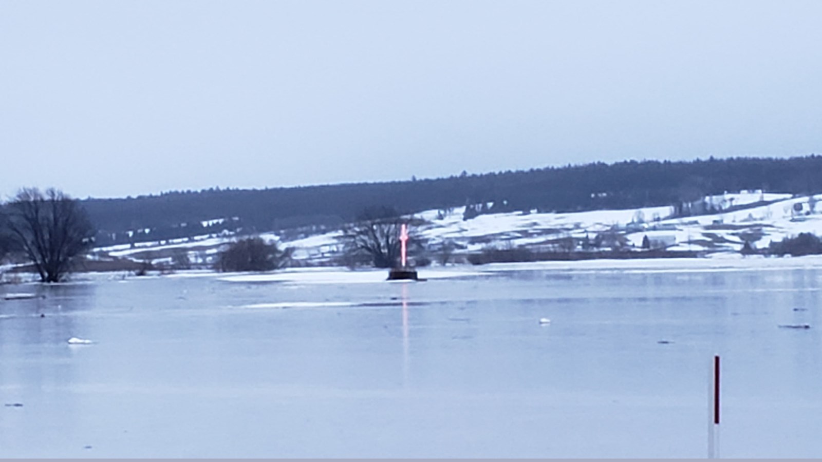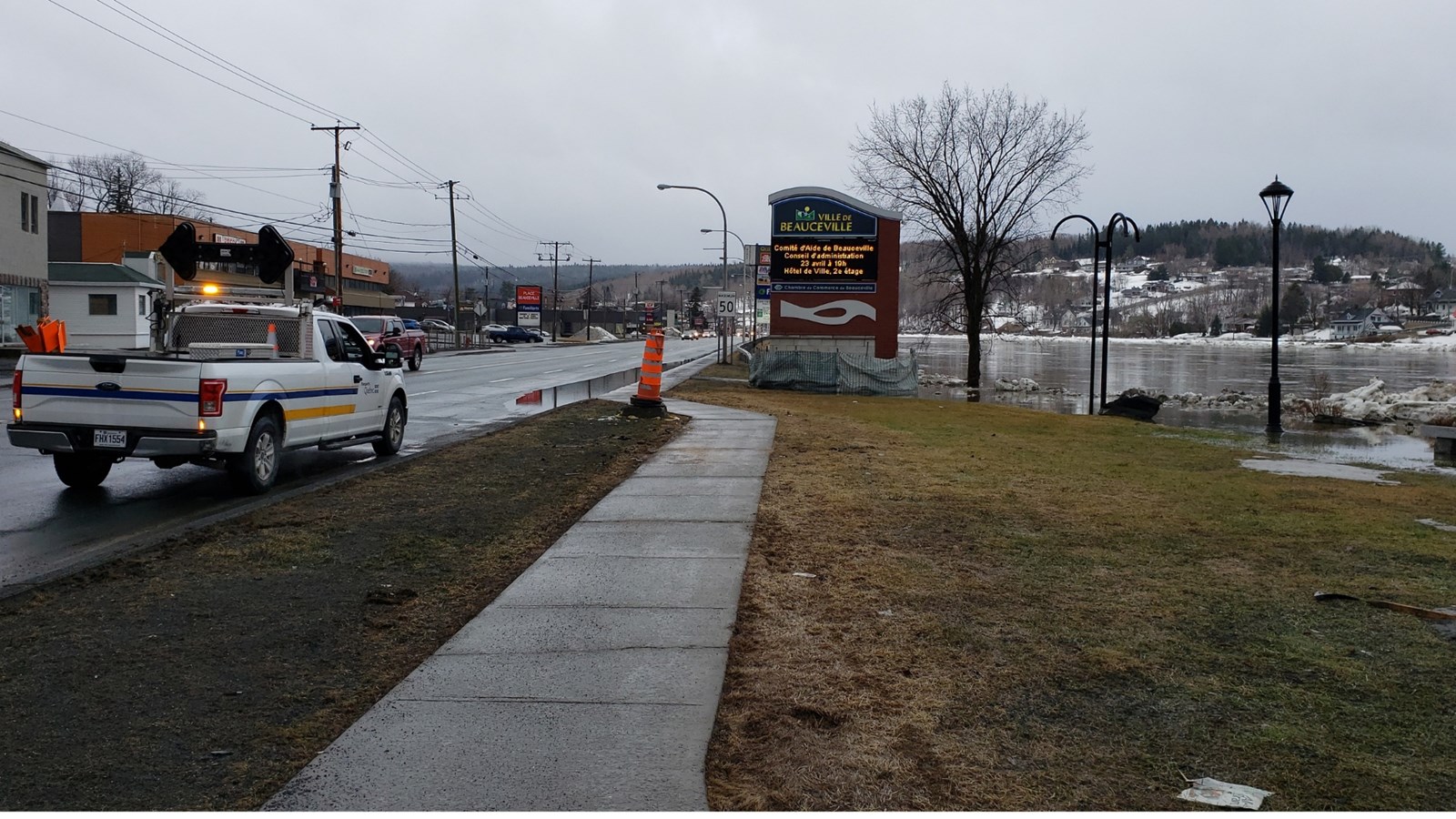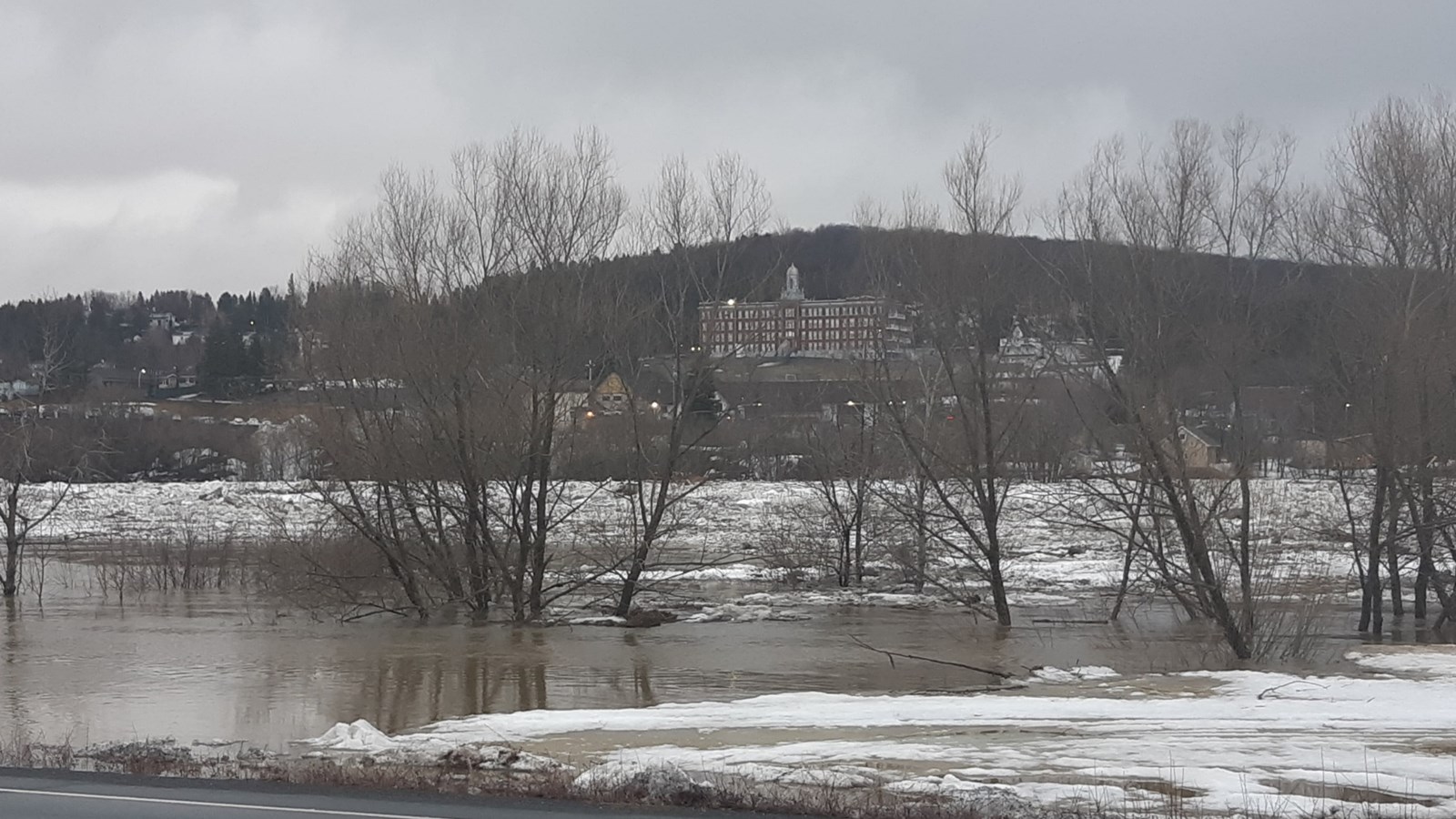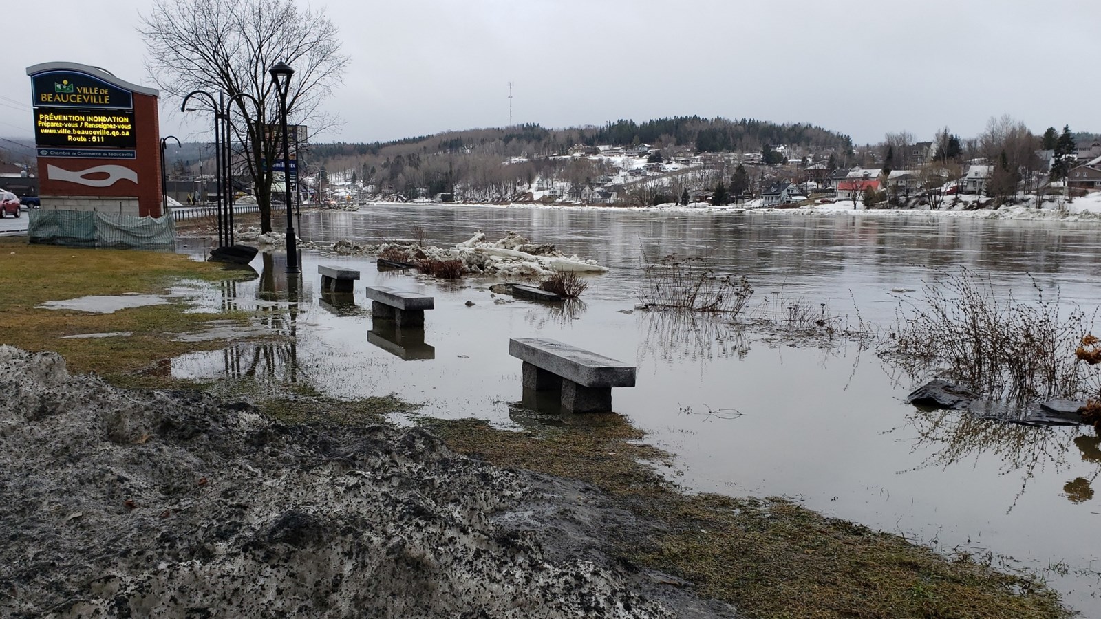 À 16h10, le niveau de la rivière a continué de monter et la cote est passée d’inondations mineures à inondation moyenne. Le niveau actuel est à 152,428 m, et ne cesse de grimper. aussi secteur de l'église.