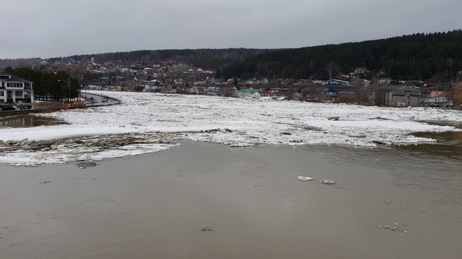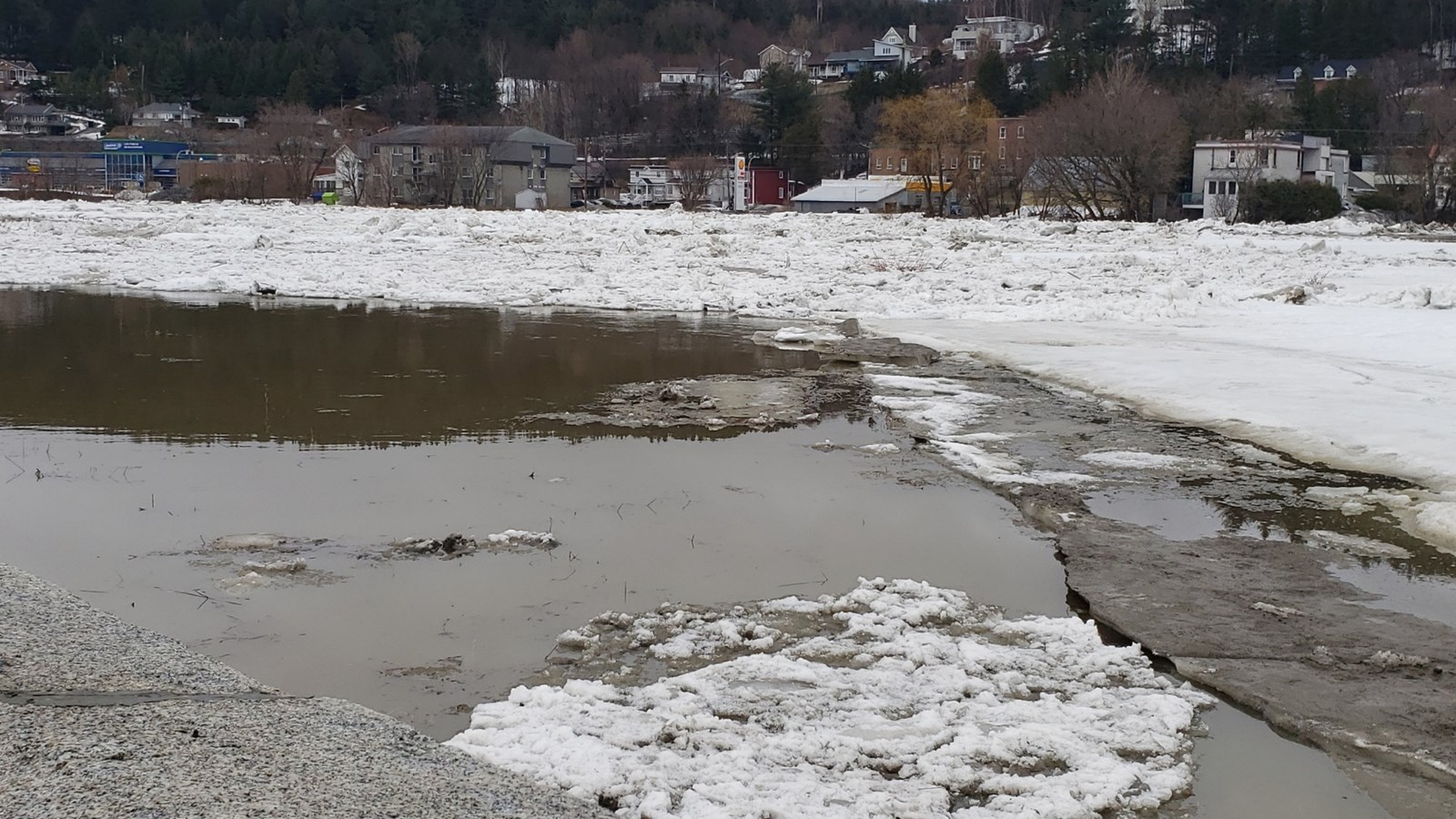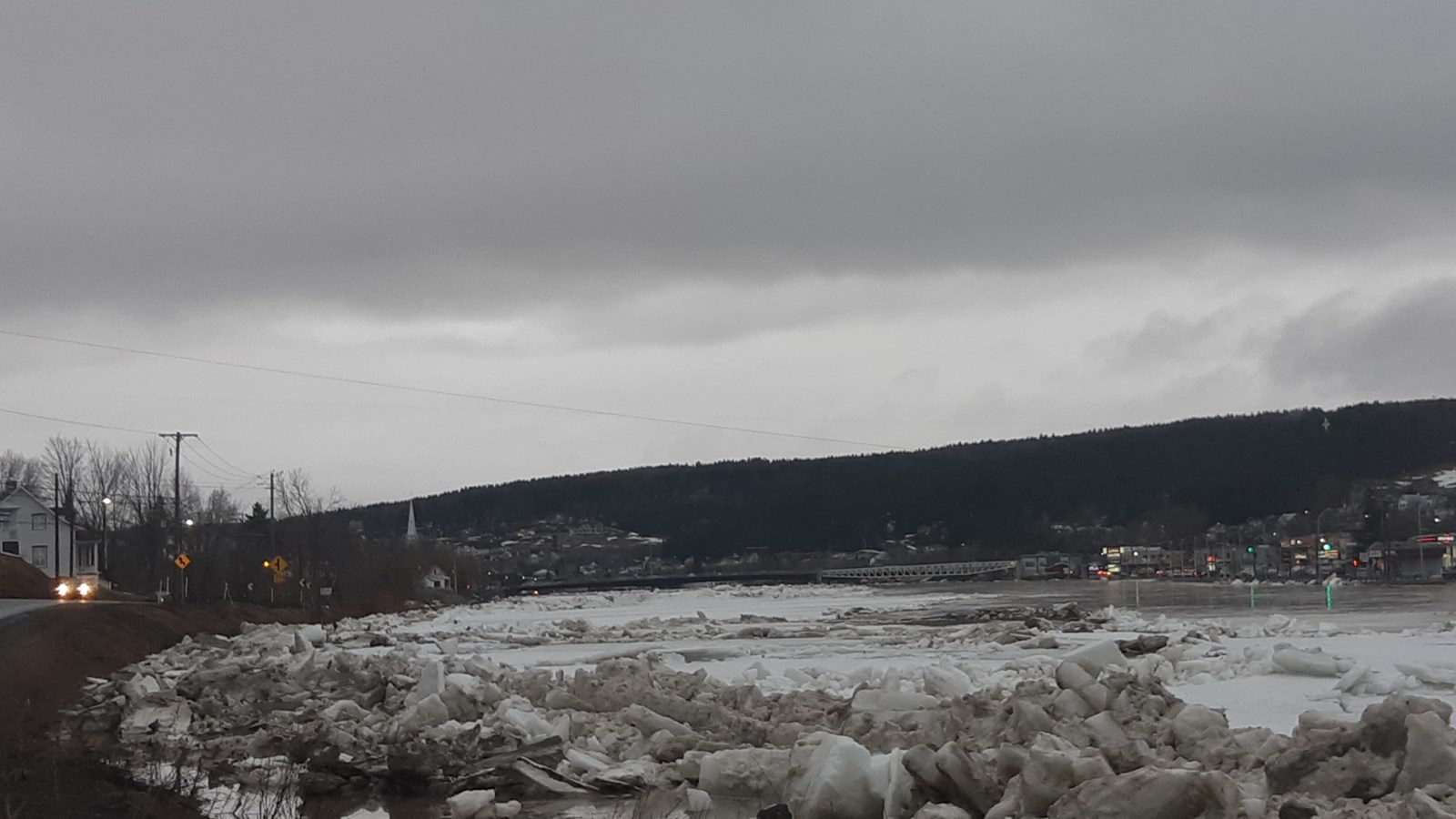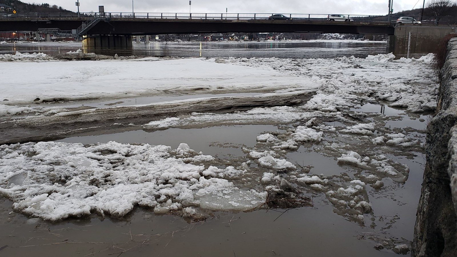 À 19h20, le niveau est toujours stable, mais un embâcle s'est formé du côté nord au centre-ville.