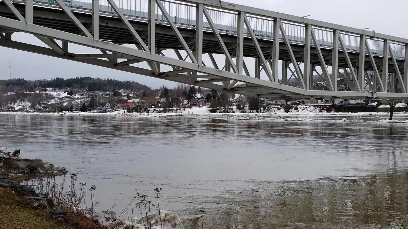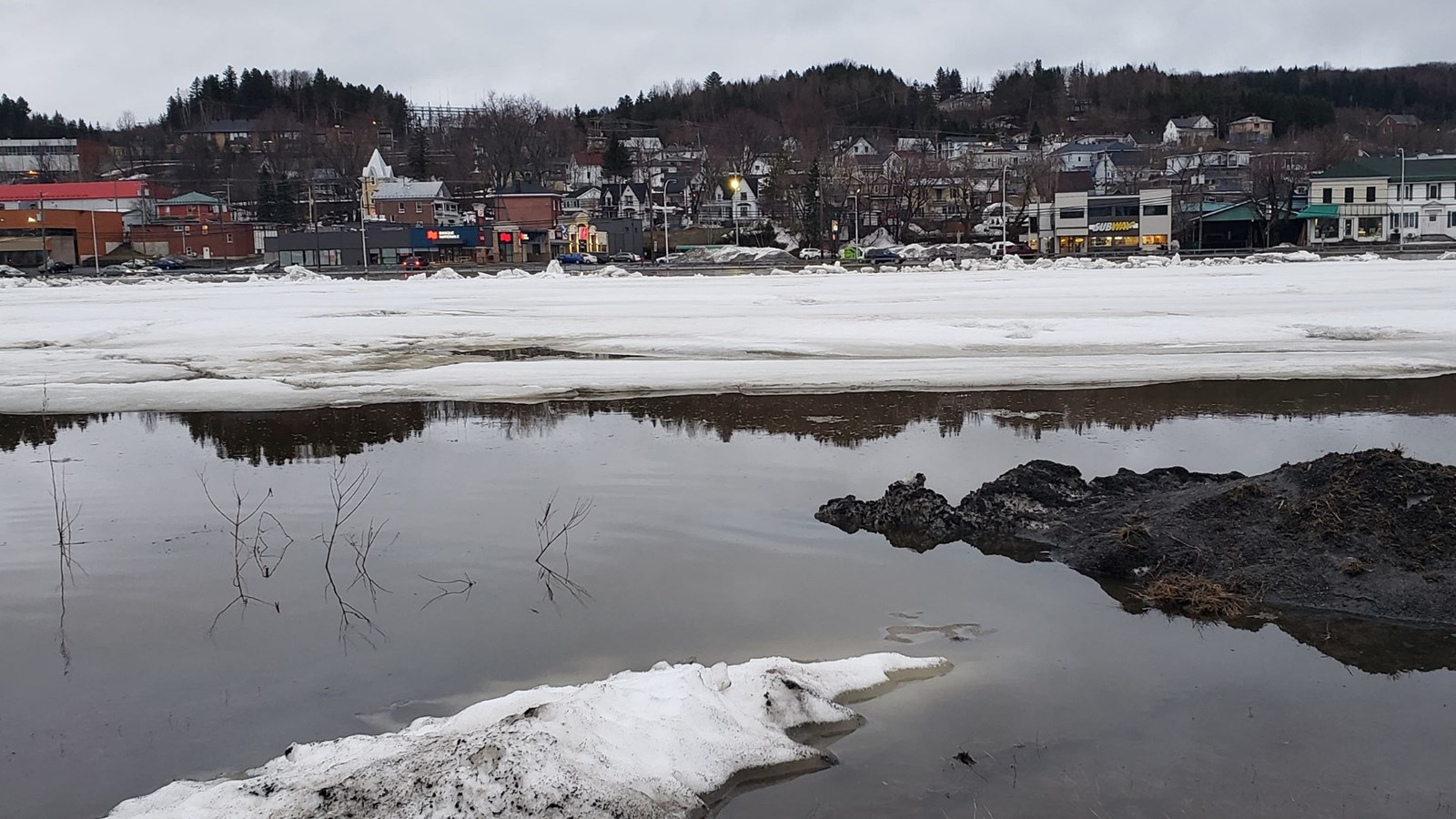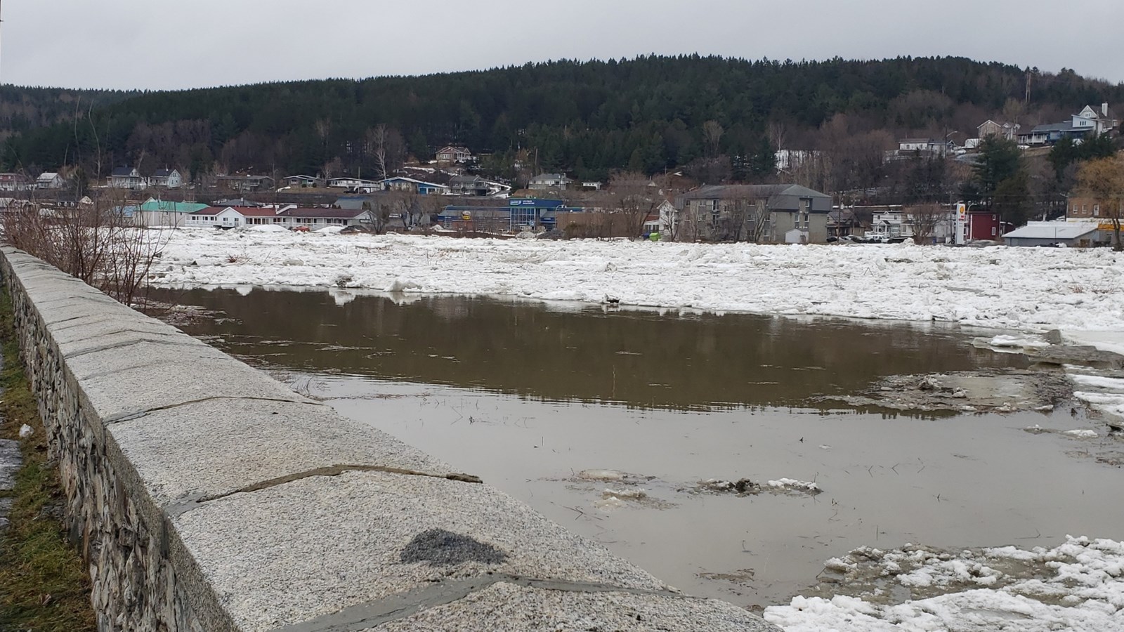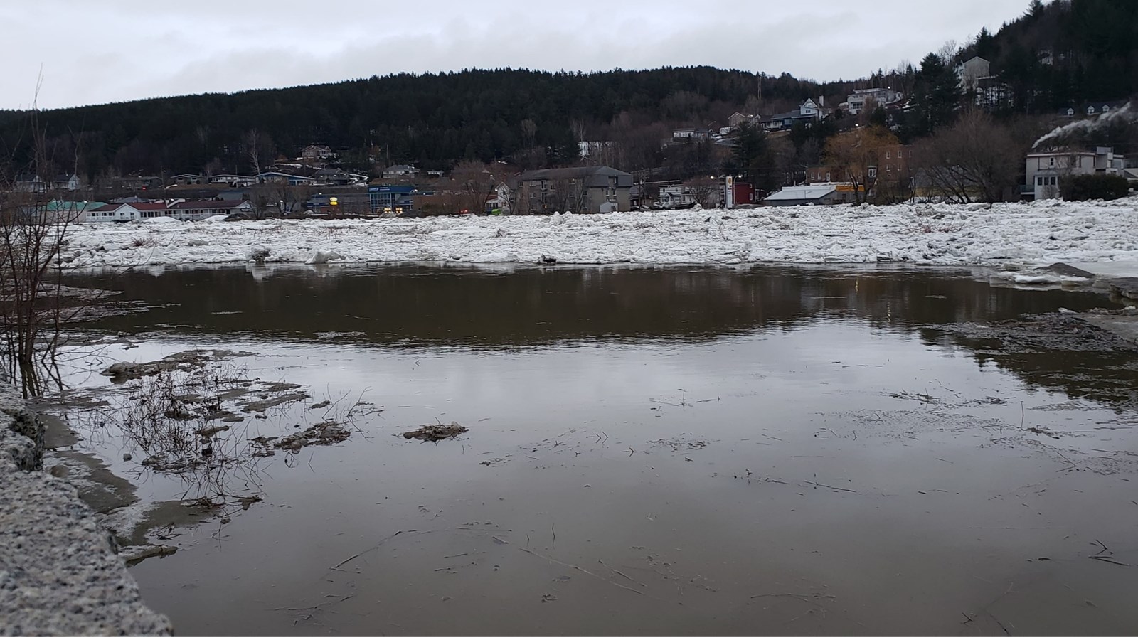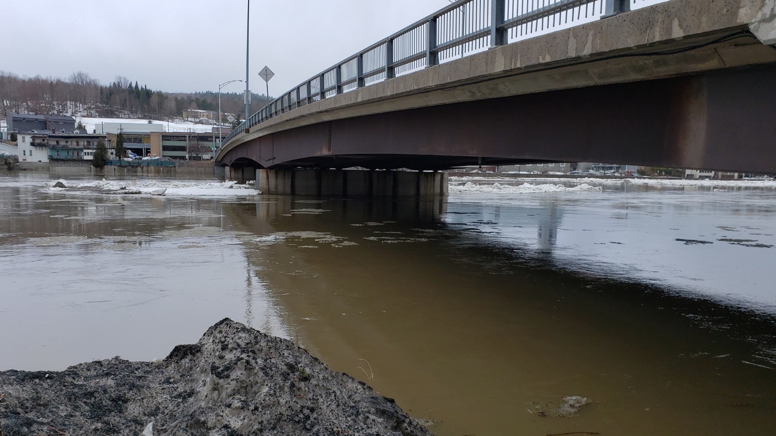 À 19h20, le niveau est toujours stable, mais un embâcle s'est formé du côté nord au centre-ville.