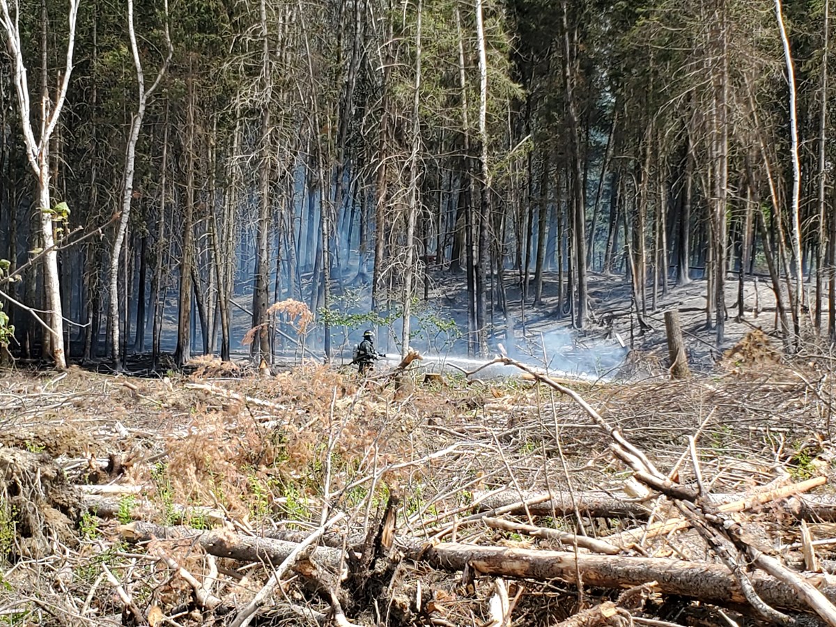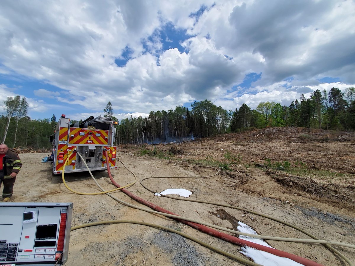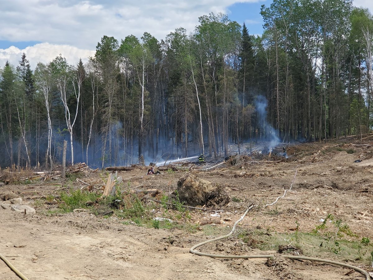 Le feu aurait pris naissance sous un engin de déchiquetage de branches (chipper) qui opérait à cet endroit. Au moment de cette mise à jour, le feu n'était pas encore complètement éteint alors que le vent s'est mis de la partie, rendant la situation instable.